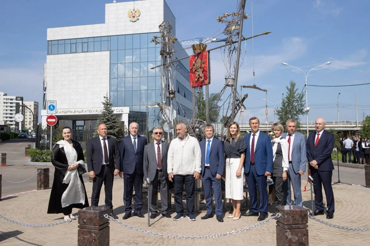 На открытии красноярского сооружения, своей замысловатой конструкцией напоминающей кафкианскую: «Работ, аналогичных открытой сегодня композиции, в городском пространстве еще не было, и она символизирует не только законность, но и творческий подход судей к своей работе», — это уже наш современник, председатель заксобрания края Алексей Додатко (цитирую по сайту ЗС). Он также скажет судьям, что находит много общего «в нашей с вами деятельности с точки зрения базовых ценностей… (мы) ориентируемся на интересы человека и на защиту его прав».