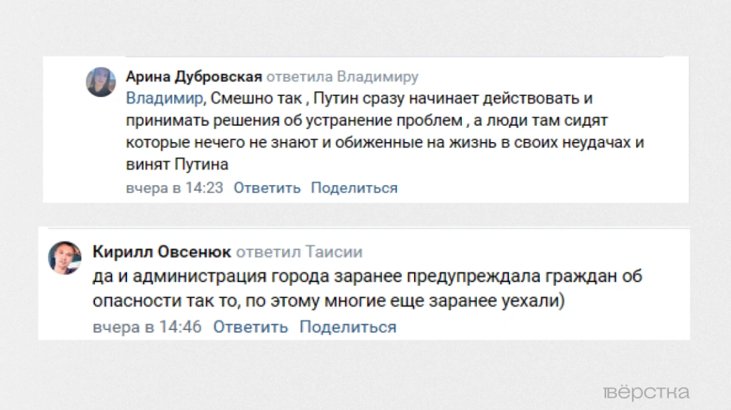 «Надо реагировать на предупреждения властей, администрации. Тем более об эвакуации говорили заранее», «предупреждение были за неделю, но игнор от людей — это их ответственность, сейчас уже принудительная эвакуация», — пишут боты.