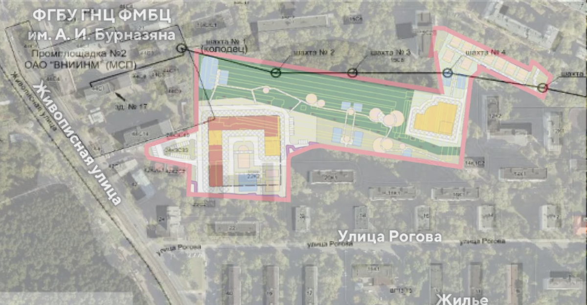 На сайте мэрии Москвы представлен спутниковый снимок предстоящей застройки. На этой территории проложен трубопровод, по которому радиоактивные отходы попадают на станцию переработки. Станция переработки радиоактивных отходов и сам трубопровод относятся к научно-исследовательскому институту «Росатома», ВНИИНМ.