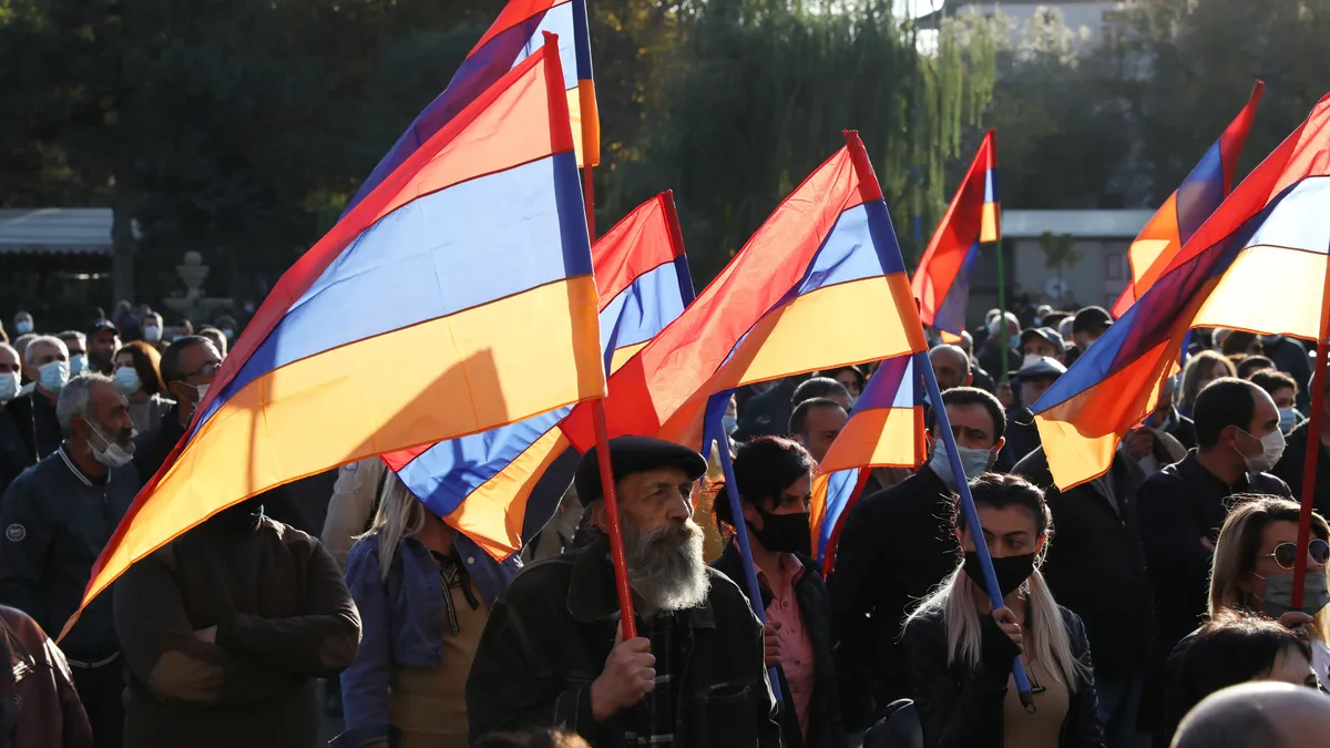Protesters flying the Armenian flag at an opposition rally in Yerevan. Photo: EPA-EFE / STEPAN POGHOSYAVN /vPHOTOLURE