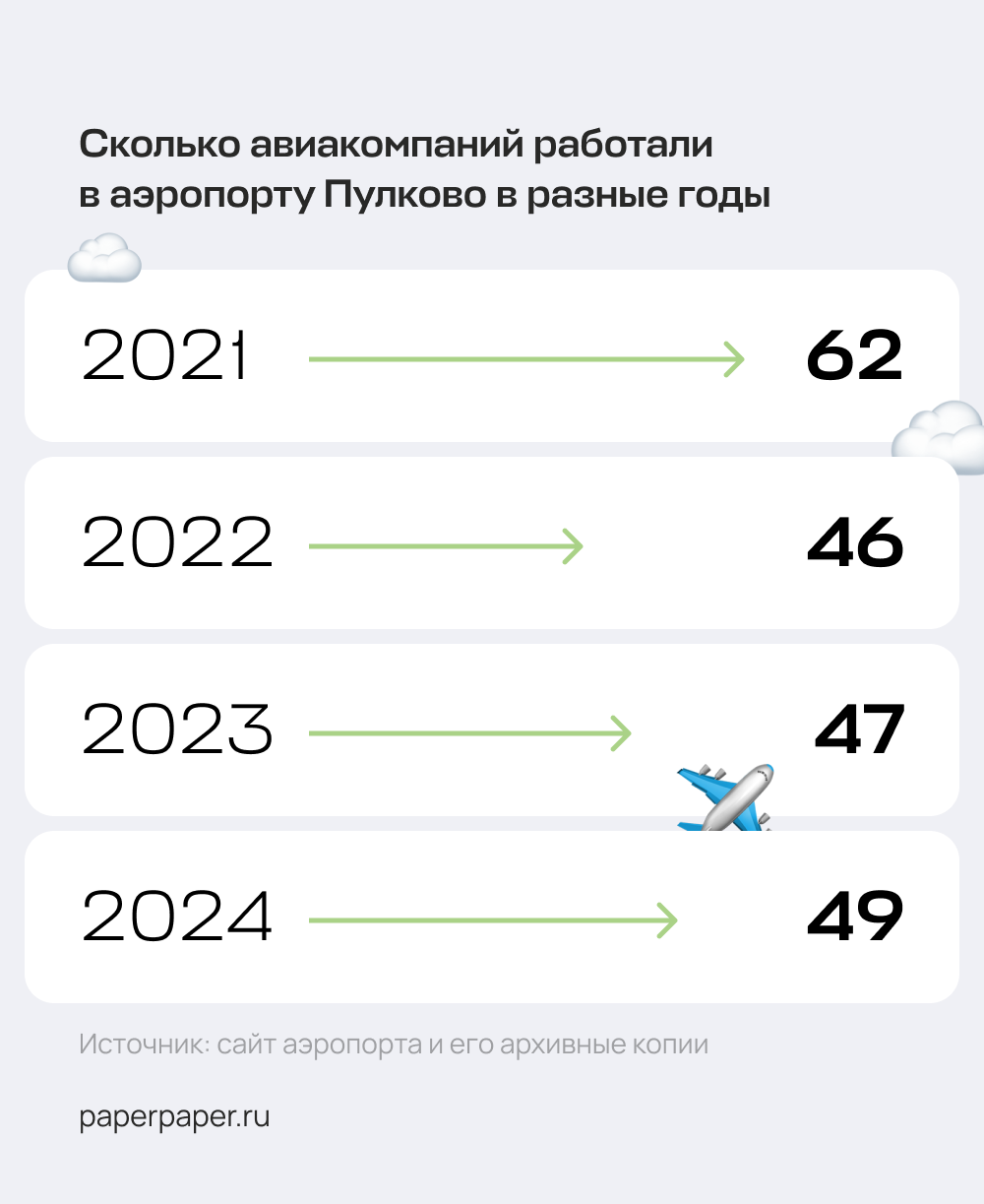 Похожая картина наблюдается и при сравнении числа авиакомпаний, которые работали в петербургском аэропорту в 2020-е годы. В 2022 году количество таких перевозчиков резко снизилось, но затем их число начало расти за счет привлечения новых авиакомпаний.