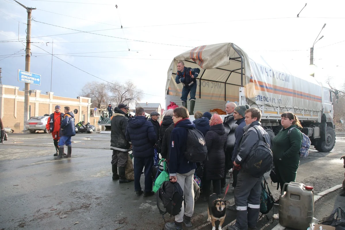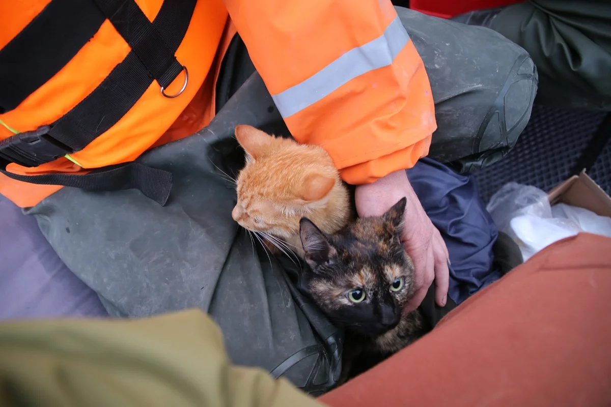 Мы подъезжаем к островку суши с провизией от волонтеров — выгружаем из машины канистры с водой и бензином, сухой паек и теплые вещи. Тут спасателей уже ждет группа жителей, готовых отправиться в пункт временного размещения в новой части города — у них минимум вещей и домашние питомцы под мышками, на поводках и в сумках-переносках.