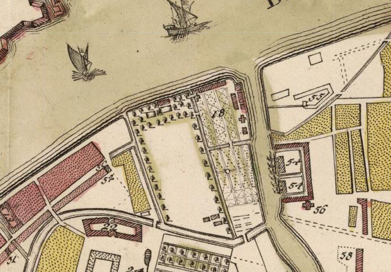 Пересечь Поперечный канал можно было по Шутишному мосту. Эта переправа работала примерно так же, как фонтаны-шутихи в Петергофе: по краям моста установили водометы, которые поливали водой тех, кто решил перейти канал.