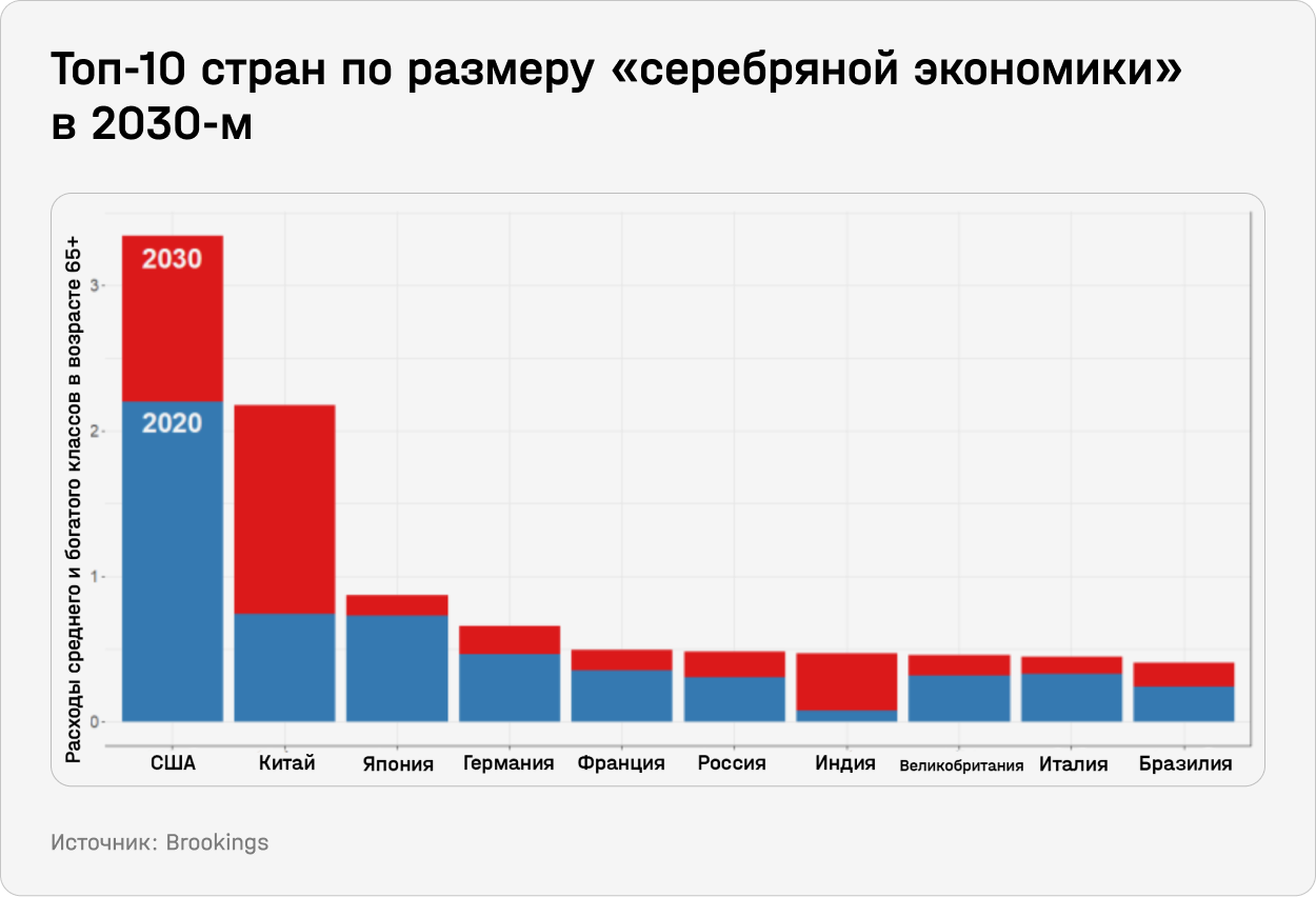 World Data Lab прогнозирует, что расходы группы людей старше 50 лет будут расти с CAGR 6,5% в течение следующего десятилетия. Уже в 2024 году на долю пожилых людей придется 42% общих расходов во всем мире. Согласно данным исследовательского института Brookings, к 2030 году траты старшего поколения во всем мире увеличатся с $8,7 трлн в 2019 году до $15 трлн.