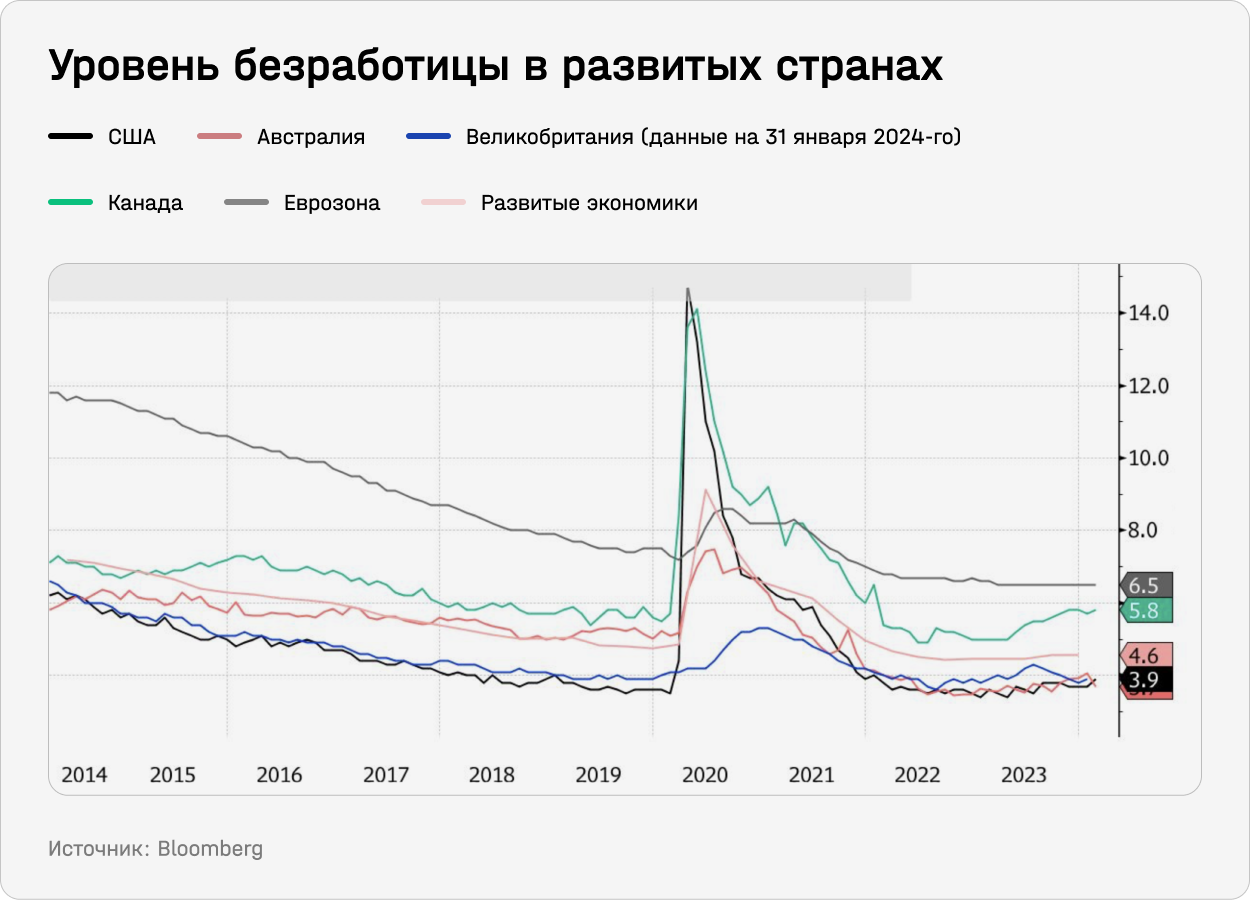 Причины высокого спроса на рабочую силу: старение населения, нехватка квалифицированной рабочей силы и относительно высокие темпы найма компаниями. И все они сохраняются, даже несмотря на повсеместное замедление экономик из-за высоких ставок, отмечает Bloomberg. Согласно квартальным данным ОЭСР, уровень безработицы в развитых странах остается близким к рекордно низким значениям. Власти США в прошлом году прогнозировали, что уровень безработицы к текущему моменту должен был составить 5,9%. В марте она снизилась до 3,8%.