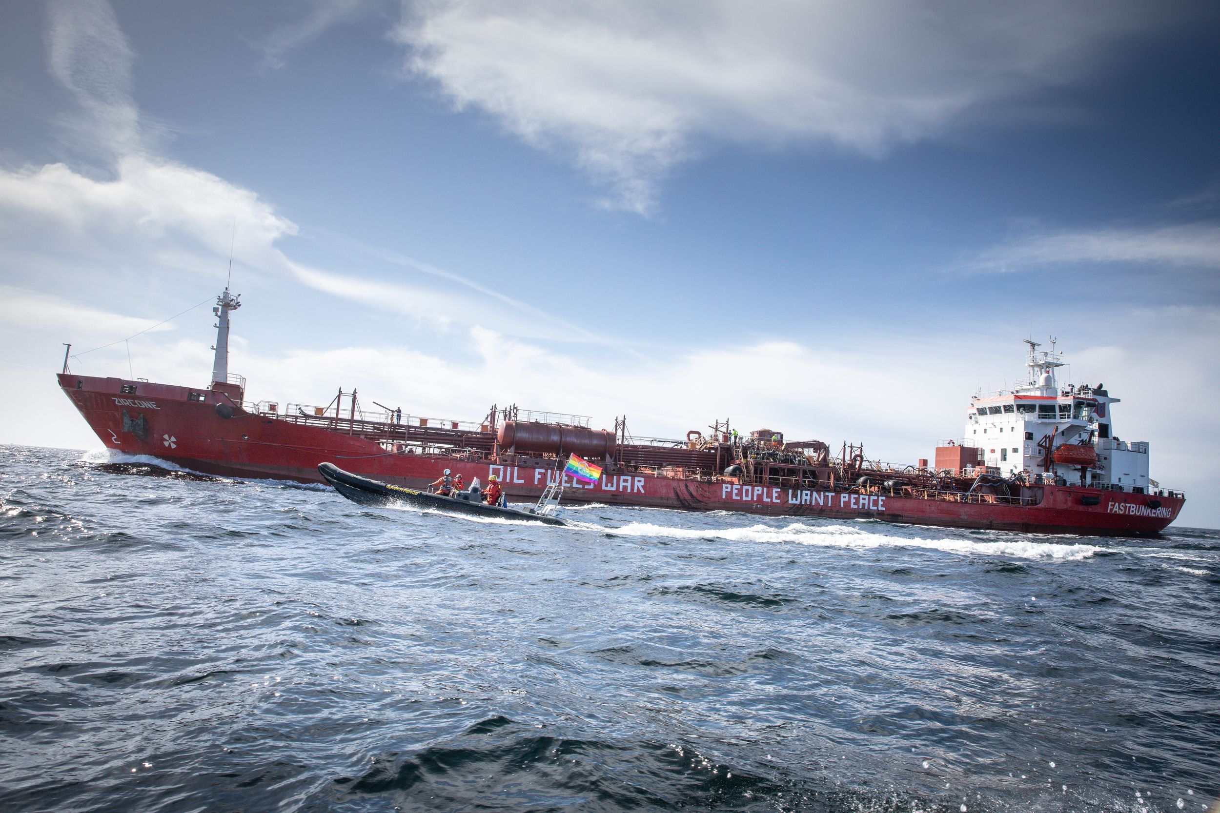 Активисты Greenpeace у шведского острова Готланд в Балтийском море настигли танкер Zircone, ходящий под флагом Кипра. Танкер вышел из порта Вентспилс в Латвии и планировал вернуться в него же 13 апреля. Утверждается, что судно входит в состав «теневого флота» России — так называют корабли, которые тайно возят покупателям российскую нефть в обход санкций Запада. «Теневые танкеры» как правило загружают нефть и нефтепродукты с российских судов прямо в открытом море. Активисты нанесли на борт танкера надпись «Oil fuels war. People want peace» («Нефть разжигает войну. Люди хотят мира»).