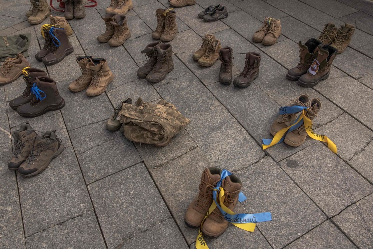 На этом фото — обувь украинских военных, пропавших без вести на войне, в частности, на бахмутском направлении. Такую акцию провели родственники и друзья военнослужащих на Майдане Незалежности в центре Киева.
