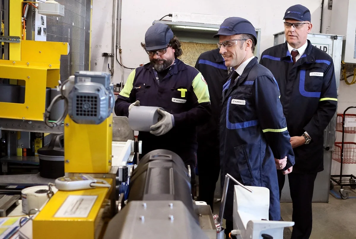 Макрон первым делом посетил — в каске и халате — действующее производство, а затем сфотографировался на церемонии закладки «первого камня» порохового завода.