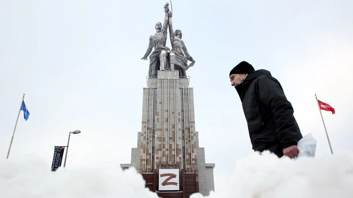Скульптура «Рабочий и колхозница» со знаком буквы Z в Москве. Фото: Максим Шипенков / EPA-EFE