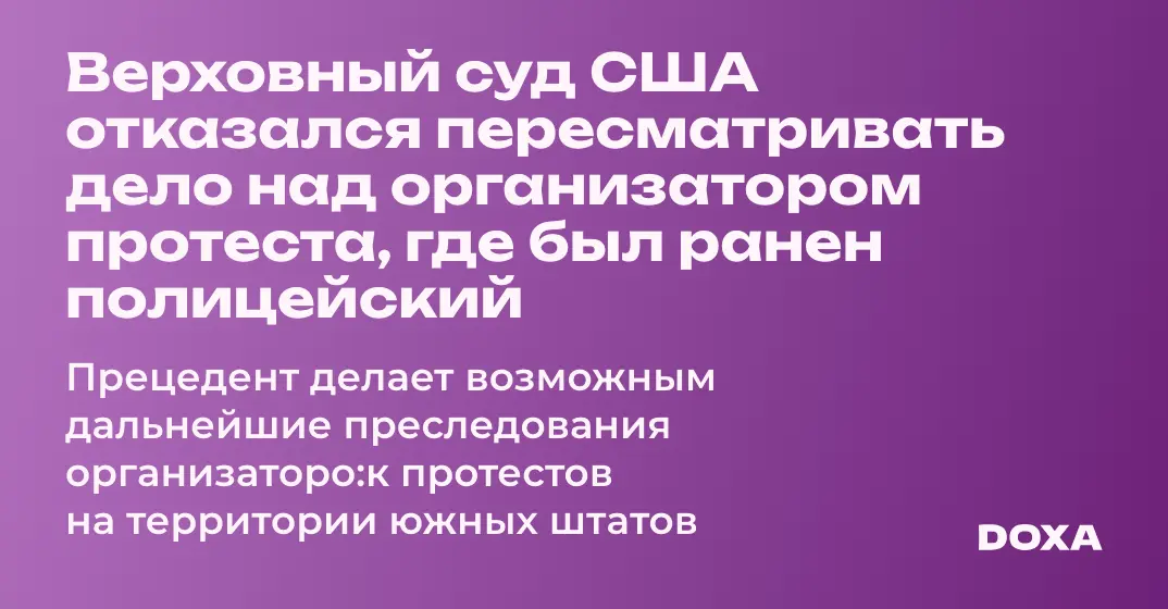 Верховный суд США отказался отменять приговор над организатором акции протеста, где был ранен полицейский. Это значит, что решение, принятое судом низшей инстанции, может действовать как прецедент в Луизиане, Миссисипи и Техасе.