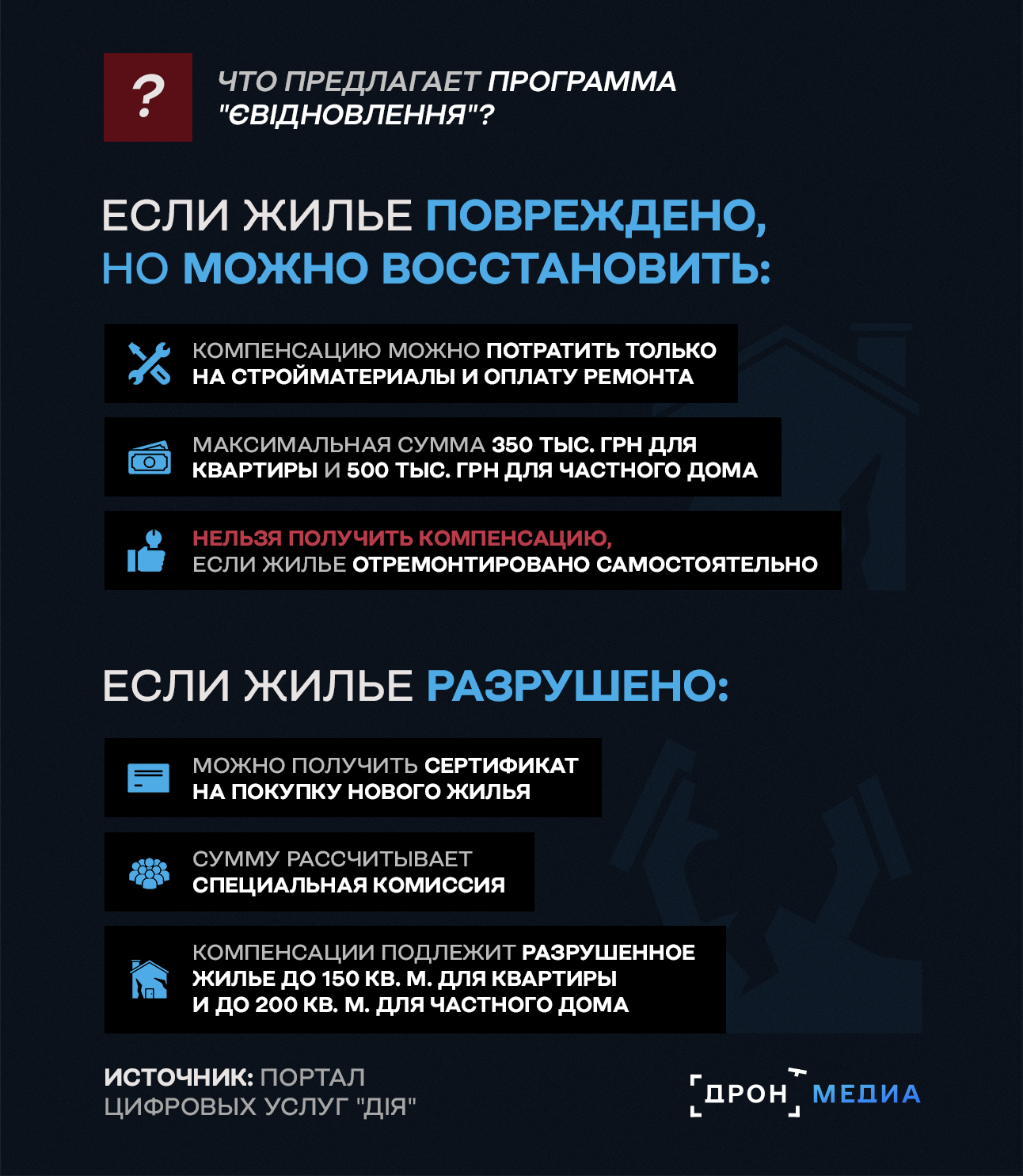 Как украинское государство помогает восстанавливать разрушенное жилье украинцев? Инфографика "Дрона"