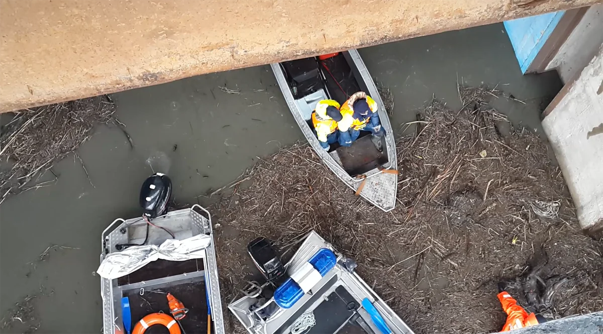 Вокруг лодки: цепляют мусор, гонят его дальше. Подрабатывая моторами, дают распиливать сучья. Здесь же привезенная в Курган аэролодка «Пиранья 6» — два дня перед этим она работала ледоколом: на ней гоняли перед опорами моста, «ослабляя ледовое поле», разрыхляя лед.