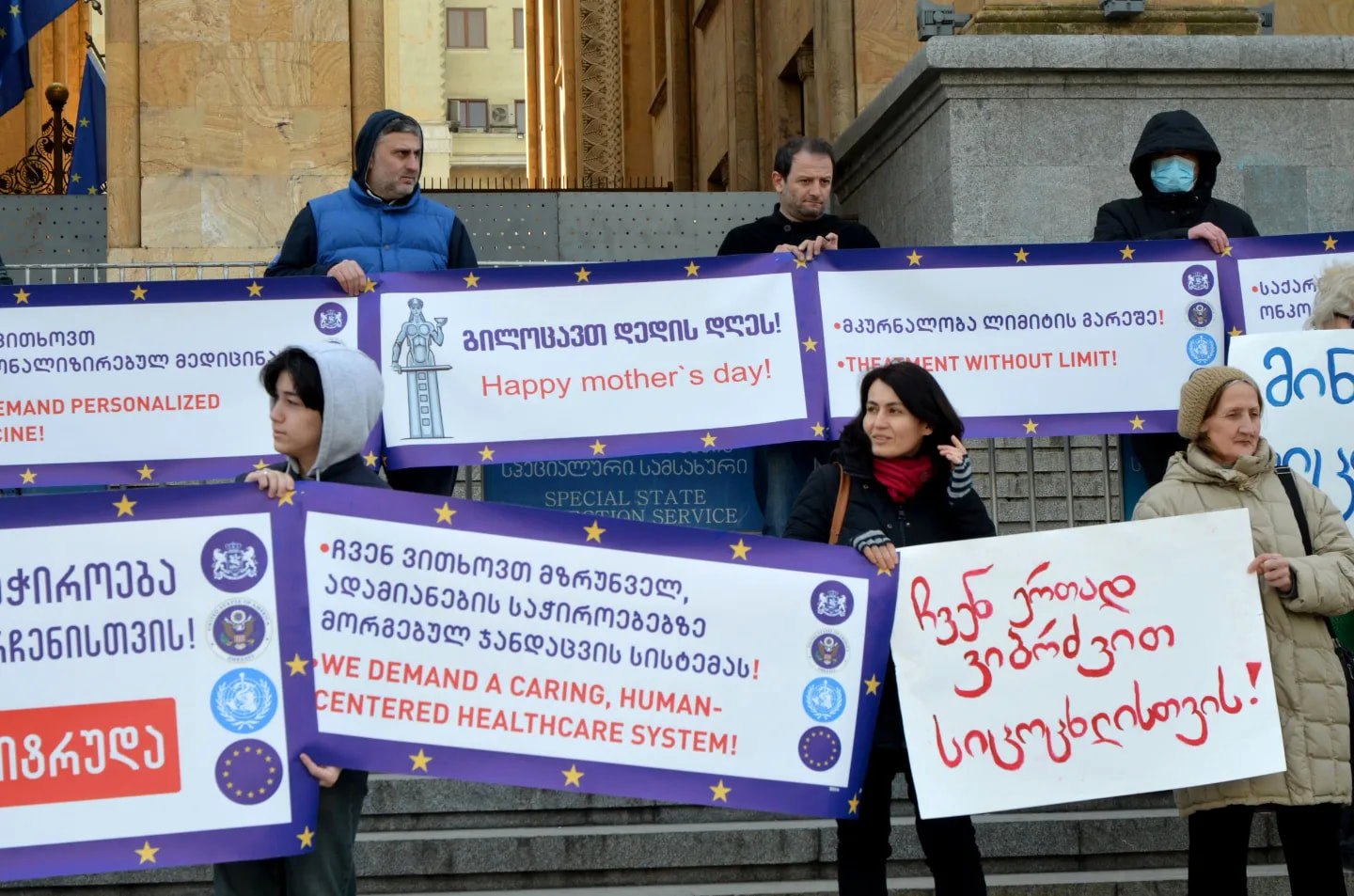 В ночь на 9 апреля онкопациенты и активисты движения «Союз за жизнь» в знак протеста остались на ночь у здания администрации правительства. К тому моменту прошло более двух месяцев с первого митинга перед парламентом под лозунгом «Хочу жить». Тогда, 4 февраля, активисты заявили, что обещание властей обеспечить всех онкобольных бесплатным лечением не соответствует действительности — на самом деле программа ограничена лимитом в 25 тысяч лари на человека.