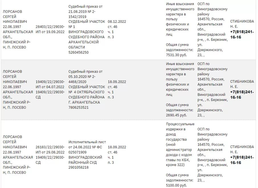В базе судебных приставов под именем Лорсанова — 14 записей, долгов — почти на 157 тысяч рублей. Илона до сих пор гасит займ, который бывший муж оформил на ее паспорт в 2019 году. При этом к банковской карте, как оказалась, помимо банка и самого Сергея, имеет доступ какое-то третье лицо. Кто именно — банк не сообщил. Ссылаясь на рассказ бывшего мужа, Илона говорит, что якобы командир вымогал у него полмиллиона рублей, обещая отпустить домой. Не исключено, что денег на счете попросту нет.