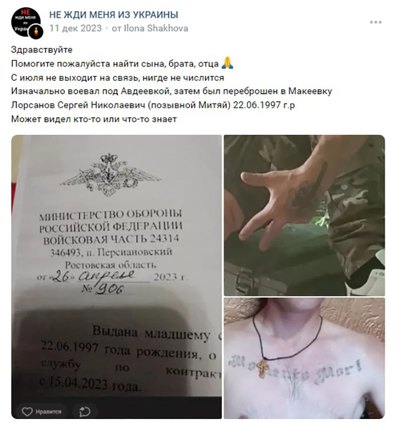 — Я ей объясняю, что у заключенных "Шторм Z" перед отправкой на передовую все документы забрали, — вспоминает Илона Шахова. — Военный билет и паспорт Сергея лежат в части 24314 в поселке Персиановский Ростовской области. После госпиталя при нем была только справка о тяжелой контузии. Говорю: мы готовы сдать ДНК, чтобы опровергнуть или доказать родство… Бесполезно.