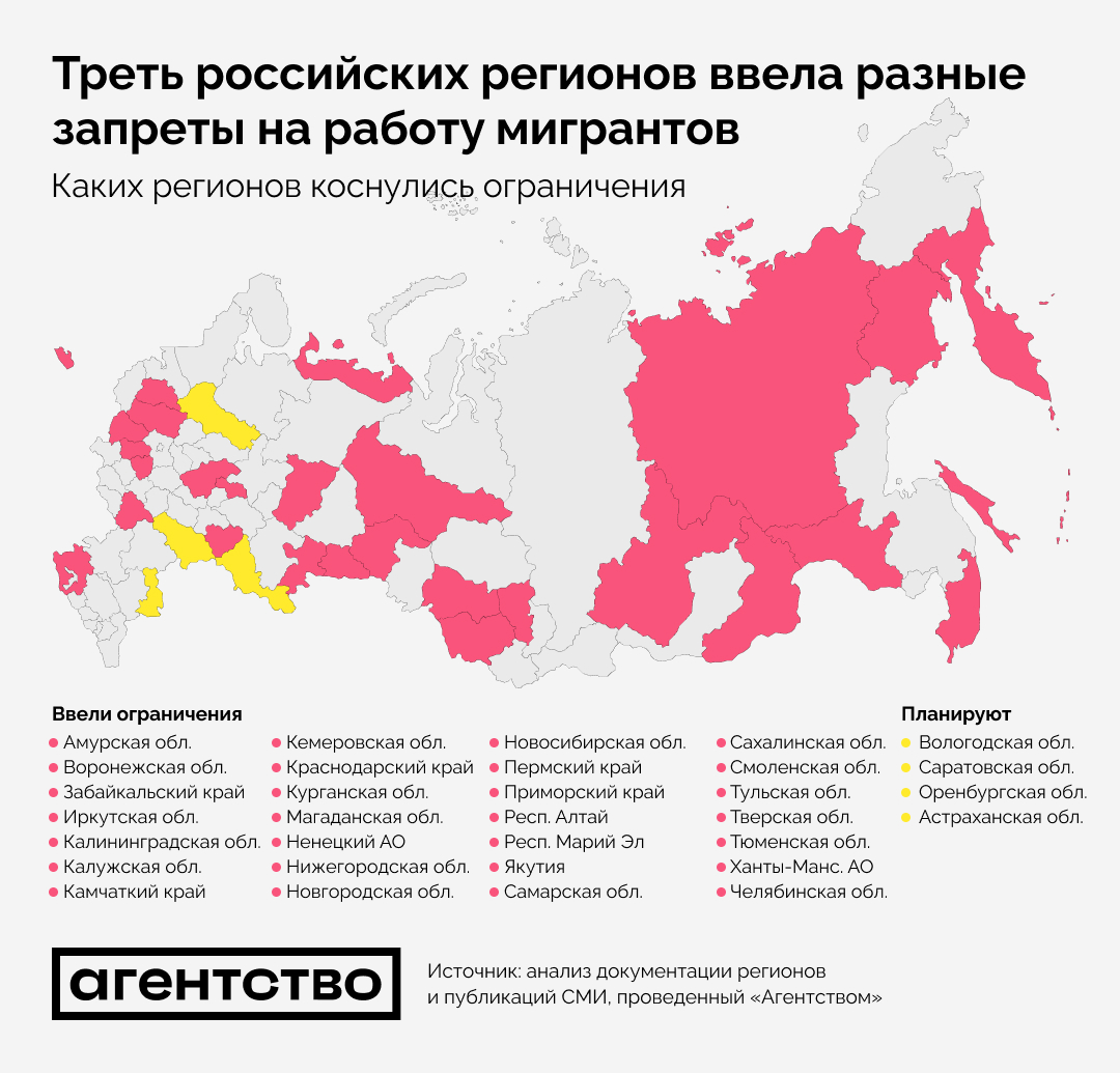 Треть российских регионов ограничила работу мигрантов. Половина из них — в этом году