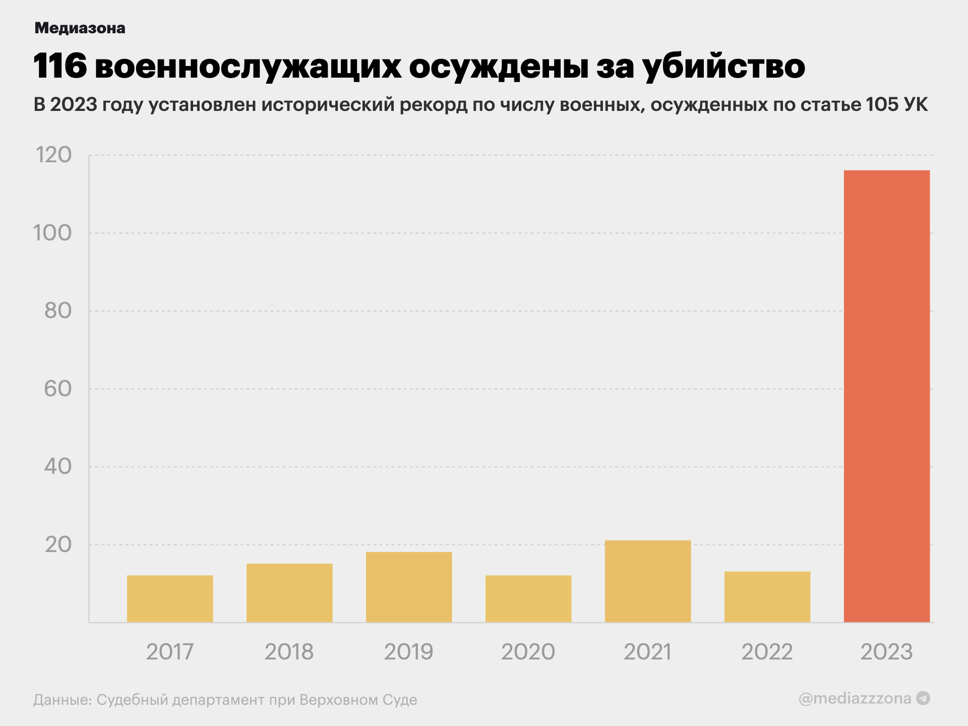 В 2023 году 116 военнослужащих осудили за убийство — почти в шесть раз больше, чем до войны