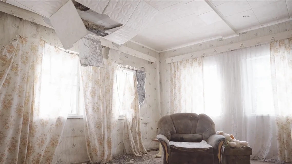 Зеленые стены испещрены следами осколков. Одна из дыр — сквозная. Крыша пробита.
