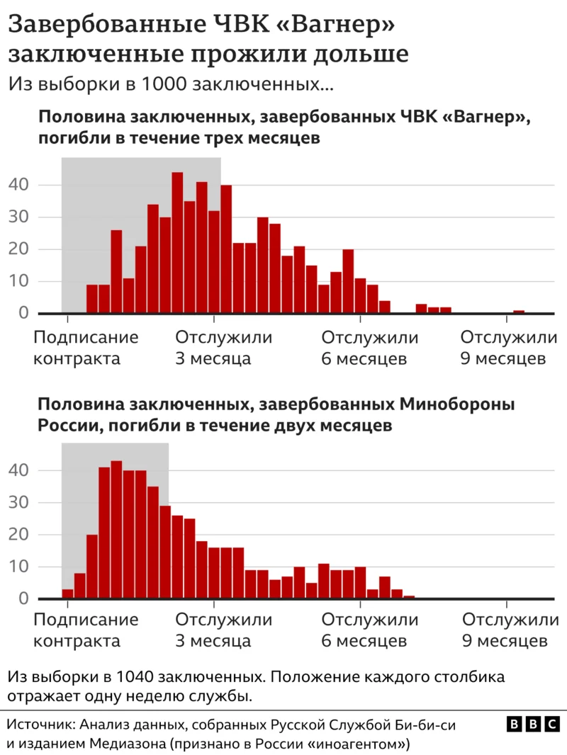 На основании известных данных, Русская служба «Би-би-си» приходит к выводу, что половина заключенных, воевавших в составе ЧВК «Вагнер», погибали через три месяца после подписания контракта. При этом заключенные, подписавшие контракт с отрядами Минобороны «Шторм», умирают в течение первых восьми недель на фронте, то есть, почти на месяц меньше.