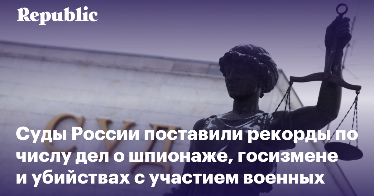 Российские суды в 2023 году поставили рекорды по числу обвинительных приговоров по статьям о шпионаже, госизмене и разглашении гостайны. Об этом свидетельствуют обновленные данные судебного департамента при Верховном суде РФ, которые проанализировал Republic. Другие независимые медиа обратили внимание на то, что в России также в разы выросло число военнослужащих, осужденных за убийства. Гарнизонные военные суды в принципе обновили показатели по количеству дел с участием военных за последнее десятилетие.