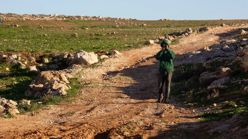 Палестинский подросток смотрит на поселенцев, пасущих скот на земле его семьи