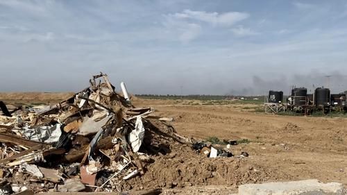 Вид с израильской военной базы. Над Газой стоит черный дым. На переднем плане — остатки домов, сожженных ХАМАС.