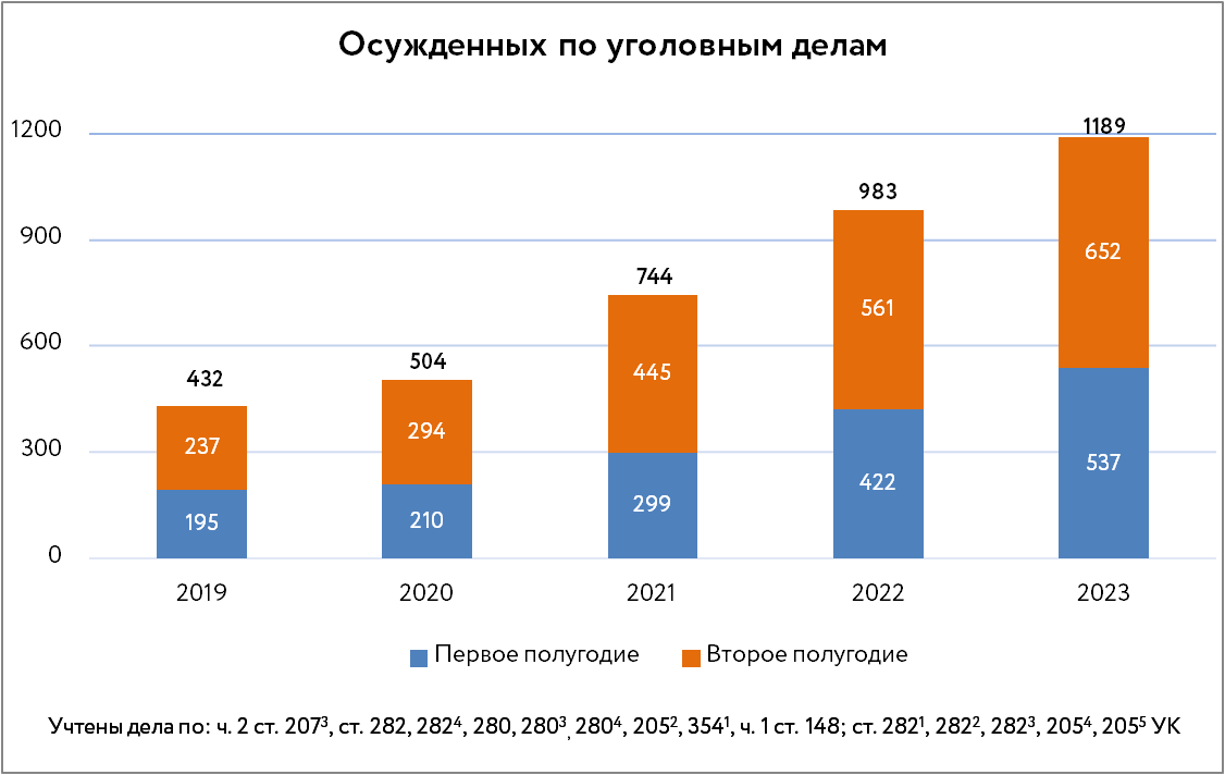 По данным департамента, в 2023 году по интересующим нас уголовным статьям были осуждены 1189 человек против 983 за 2022 год, то есть количество привлеченных к уголовной ответственности в 2023 году оказалось выше, чем годом ранее, примерно на 20 %. Отметим, что в 2022 году осужденных по уголовным статьям, применение которых мы отслеживаем, было на 32 % больше, чем в 2021-м.