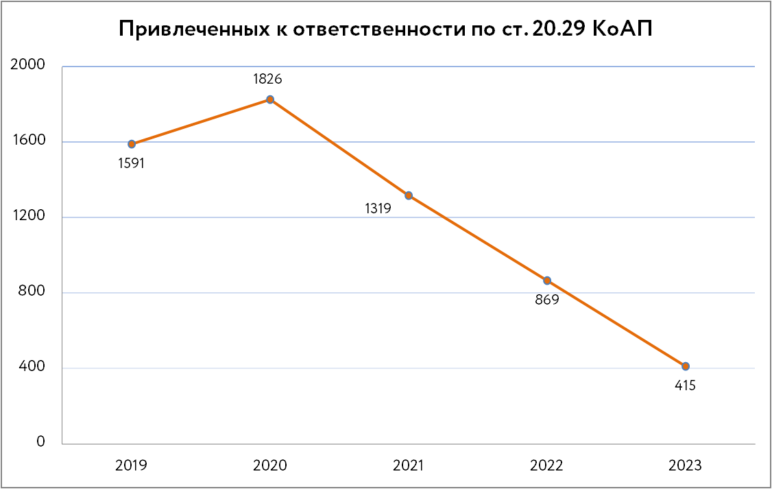 В 2023 году суды подвергли наказанию по ст. 20.29 КоАП о распространении экстремистских материалов 415 лиц (402 физических лица, семь должностных, два юридических и одного предпринимателя). Таким образом, продолжается тенденция к снижению числа санкций по этой статье: в 2022 году они назначались 869 раз, в 2021 — 1319 раз, в то время как в 2020 году — 1826 раз. В 2023 году в 394 случаях суды назначали штраф, в 20 — административный арест, в одном случае было вынесено решение о приостановлении деятельности. В дополнение к этим санкциям 20 раз назначалась конфискация орудия или предмета правонарушения. В 74 случаях суды приняли решение о прекращении производства по делу. 12 протоколов суды вернули полиции для устранения недостатков.