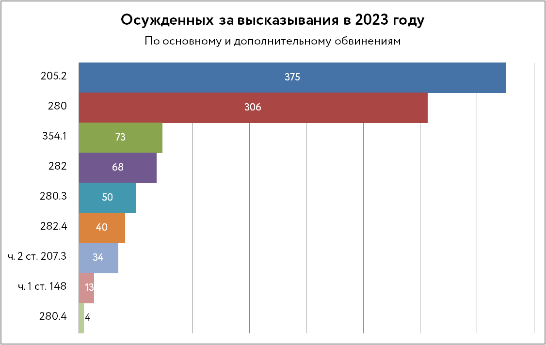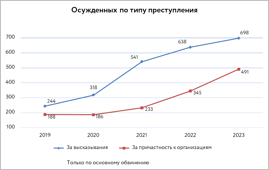 Из осужденных в 2023 году 698 человек (за 2022 год — 638) были привлечены к ответственности по статьям, карающим за разного сорта публичные высказывания (ст. 2073 ч. 2, ст. 282, 2824, 280, 2803, 2804, 2052, 3541, ст. 148 УК ч. 1), а 491 (за 2022 год — 345) — за создание экстремистских или террористических сообществ и продолжение деятельности организаций, которые были запрещены как экстремистские или террористические (ст. 2821, 2822, 2823, 2054, 2055). Таким образом, число осужденных за высказывания выросло примерно на 9 %, а за причастность к запрещенным организациям — на 42 %.