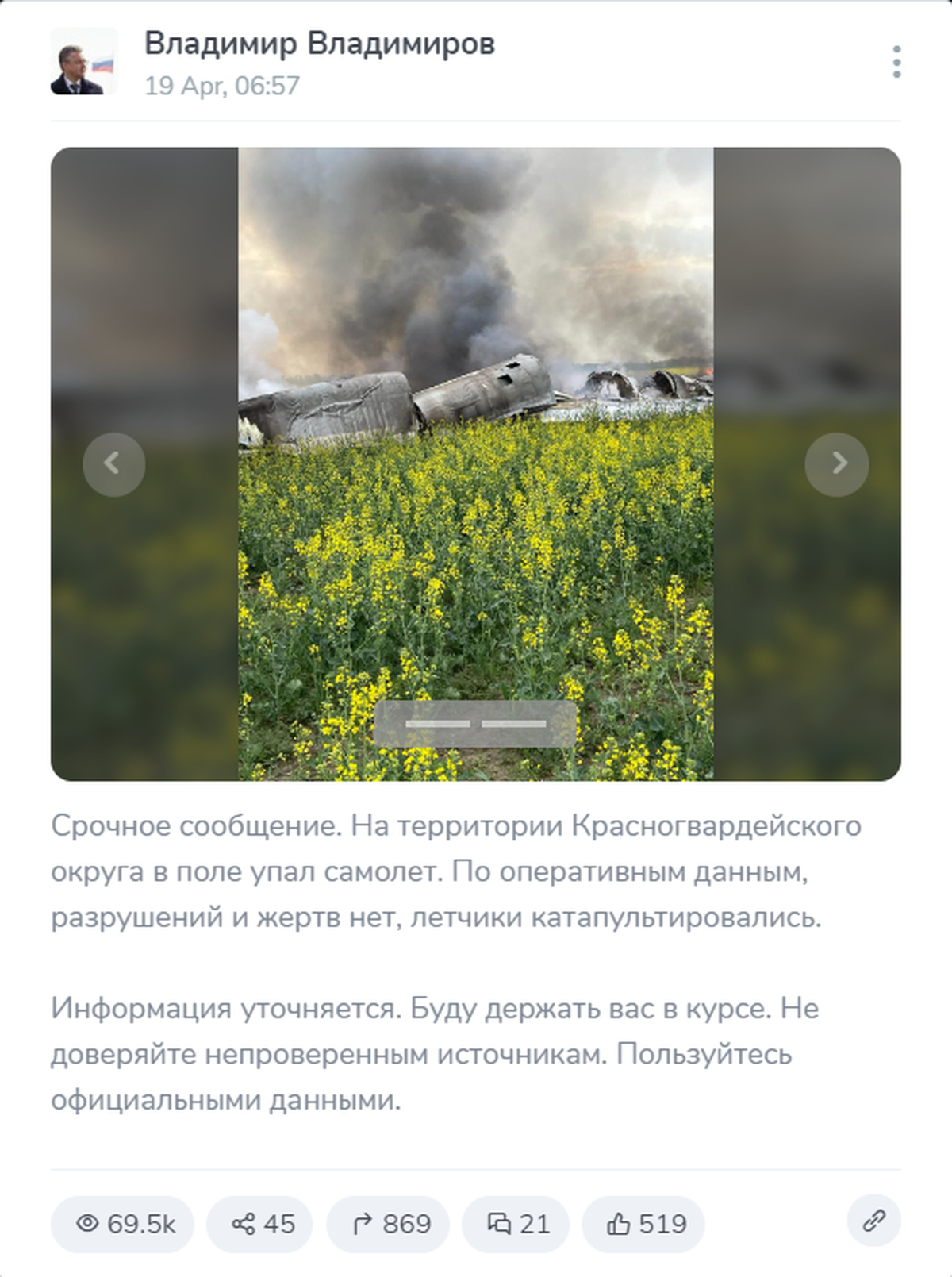 Двое членов экипажа бомбардировщика были найдены и доставлены в больницы, один погиб, поиски четвертого продолжаются, сообщил губернатор Ставропольского края Владимир Владимиров. Он удалил пост с фото разбившегося самолета, который ранее разместил в телеграм-канале.