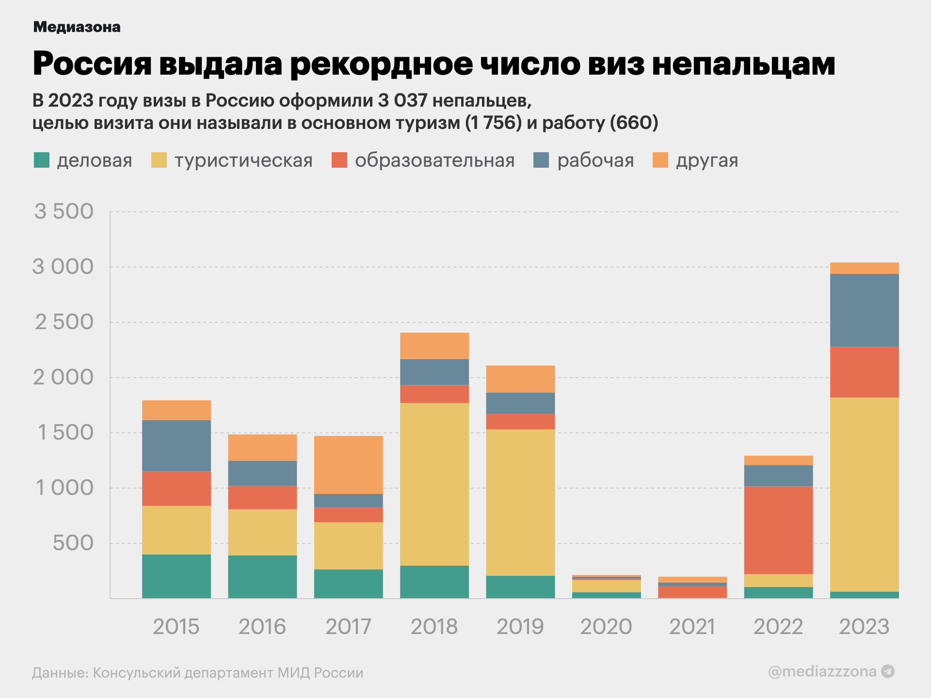 Сведения МИД согласуются со статистикой пересечения границы от ФСБ, которую ранее исследовала «Медиазона». Пограничники отчитались о том, что в 2023 году в Россию въехали 1 039 непальских туристов. Остальные 700 получателей туристических виз могли въехать в страну уже в 2024 году; данные за первый квартал 2024 пока не опубликованы.