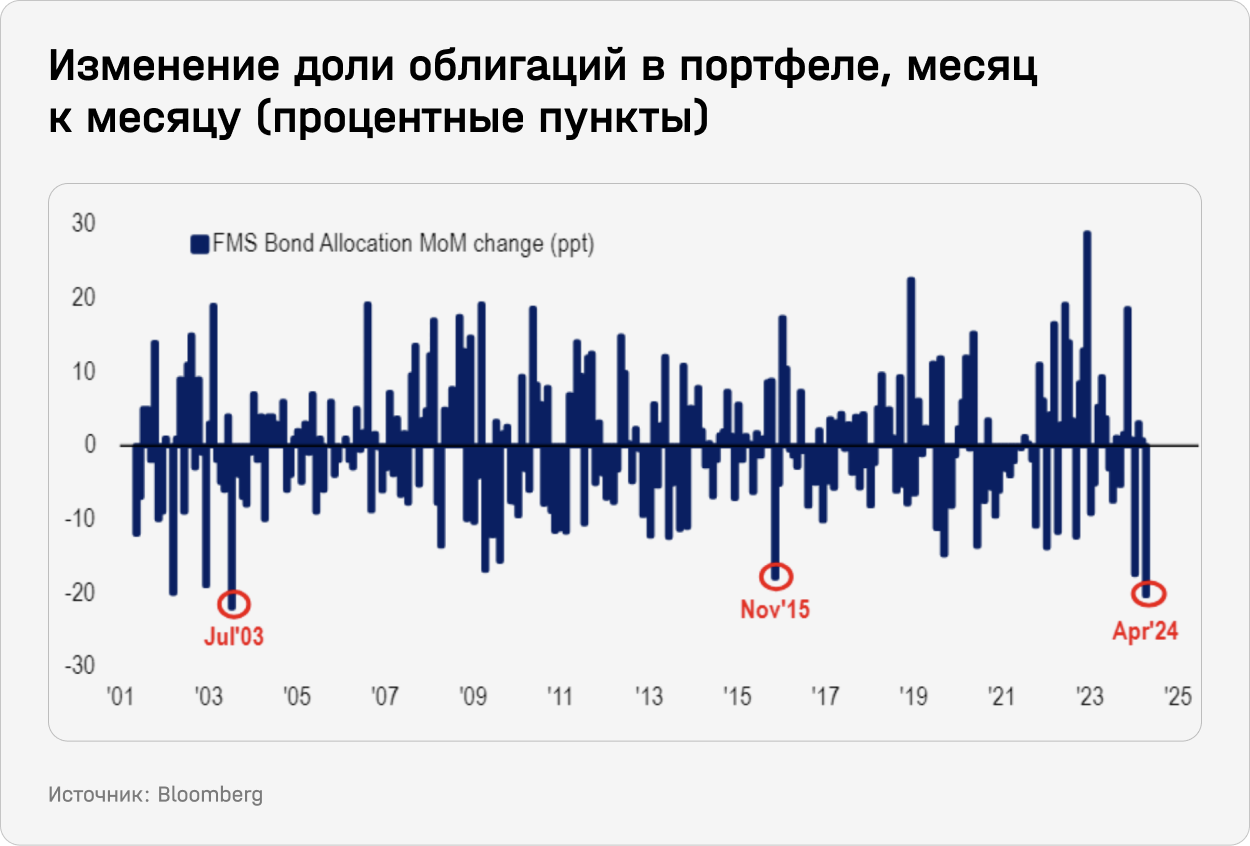 В результате доходности двухлетних трежерис на этой неделе превысили 5% впервые с ноября, с начала апреля они выросли на 42 б.п., 10-летних — на 37 б. п. В апреле портфельные управляющие снизили долю облигаций в портфелях максимальными с июля 2003-го темпами, следует из ежемесячных опросов портфельных управляющих, которые проводит Bank of America. Тогда рынки вздохнули с облегчением от того, что война в Ираке окончилась, и начали выходить из защитных активов. Сейчас причина продаж — ожидания более высоких ставок на протяжении более долгого времени.