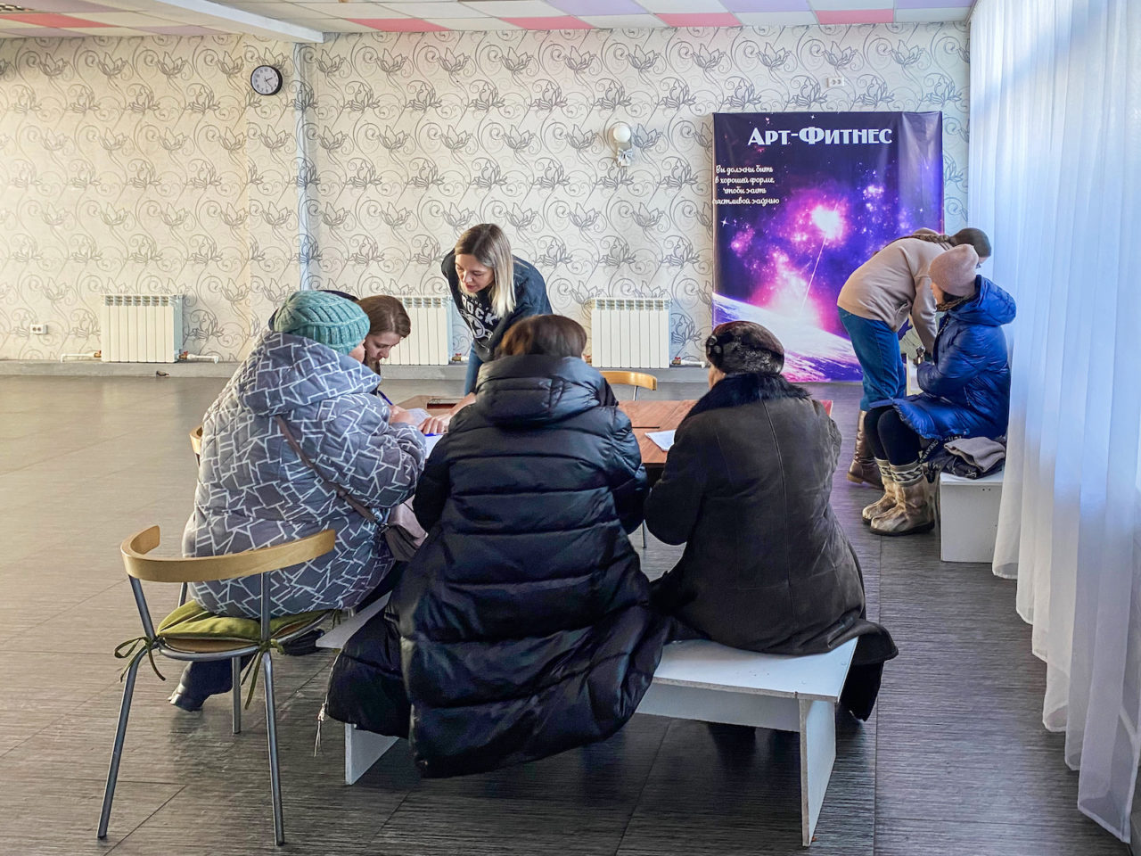 Перед началом встречи активисты Наталия и Егор (имя изменено по просьбе героя — ЛБ) вытягивают в центр спортивного зала большой стол, ставят вокруг него лавочки и стулья, на них рассаживаются пришедшие жители микрорайона. Наталия склоняется над ними и показывает, где на листах нужно поставить свою подпись и объясняет, что они нужны для суда, чтобы показать, что большое число людей против строительства суперколонии.