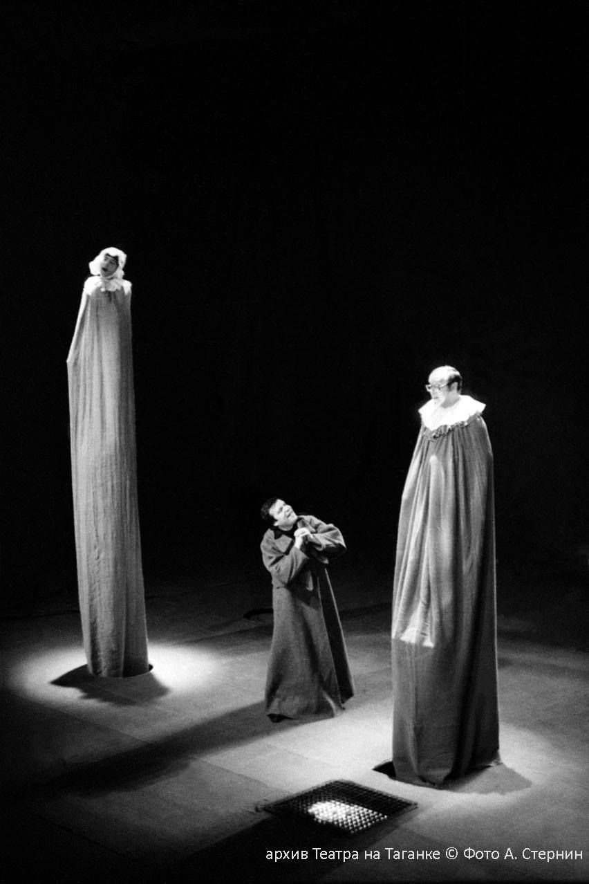 Кстати, это не значит, что артисты не участвовали в постановке спектакля, они еще как участвовали. Есть подробные записи репетиций «Бориса Годунова»: Любимов просит артистов самих подумать, с какими фразами они хотят обращаться к залу. В каком-то смысле актеры были соавторами концепции Любимова. А ведущие артисты — [Леонид] Филатов, [Валерий] Золотухин, [Вениамин] Смехов — тоже могли присутствовать на дискуссиях с чиновниками от культуры.