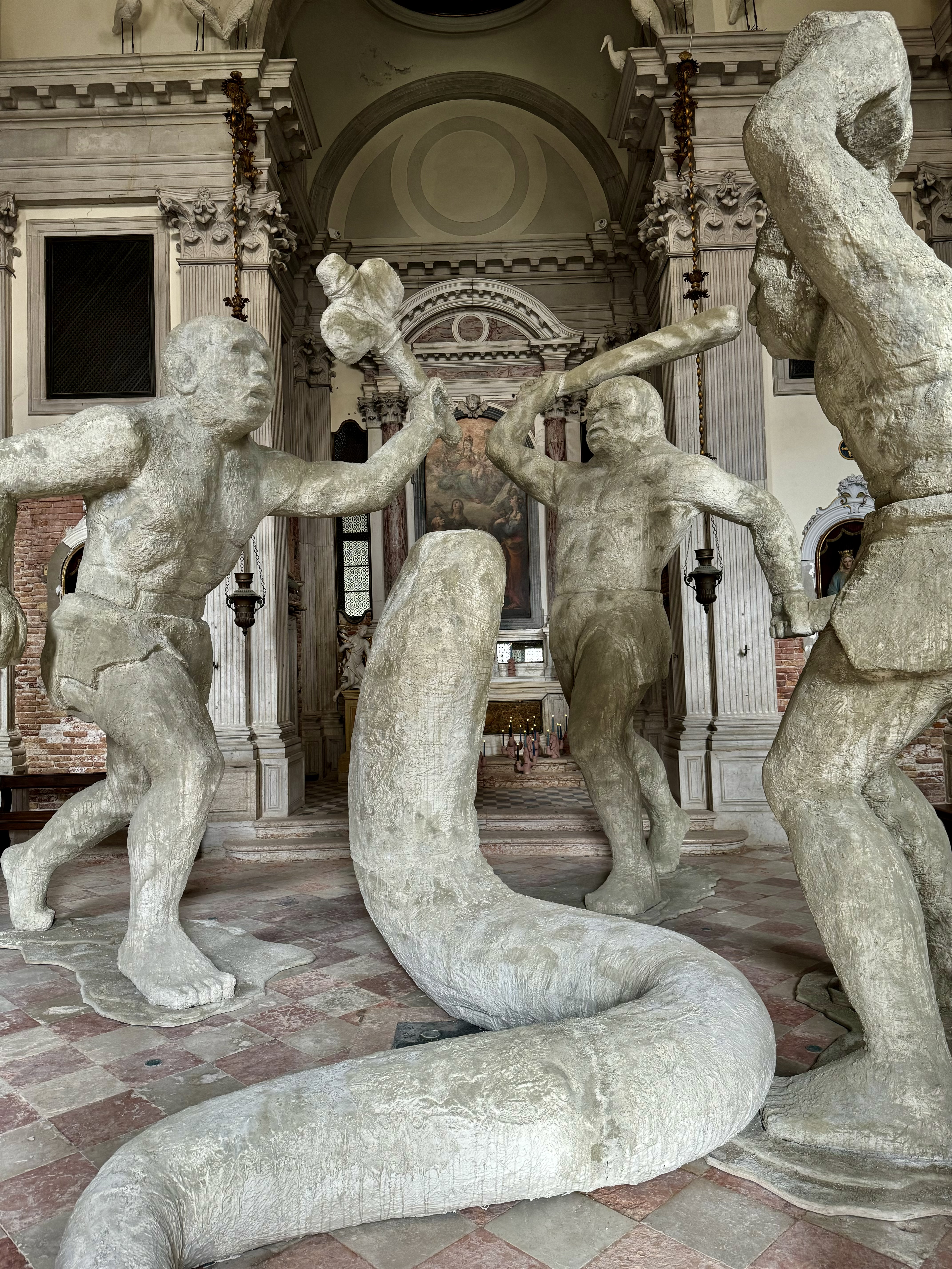 Если вы приехали в Венецию не на собственной яхте, как миллиардер Лен Блаватник, припарковавший белоснежное судно "Odessa 2" у всех на виду, а на поезде или автобусе, вы можете начать знакомство с 60-й Биеннале современного искусства с павильона Эстонии – он ближе всего к вокзалу. Скульптор Эдит Карлсон преобразила полузаброшенную церковь Санта-Мария-делле-Пенитенти, где некогда опекали проституток, решивших покончить с гнусным ремеслом, а затем открыли приют для престарелых женщин. Мы вступаем в храм и видим первобытных гигантов, сражающихся с дьяволом-змеем, оборотней-русалок, отдыхающих возле бурлящей дыры в полу, двухголового кота, грозно взирающего из каморки, и трех плакальщиц возле серванта, набитого керамическими черепами неведомых существ. Каждый уголок наполнен инфернальной живностью! Инсталляция называется "Час волка". В самый темный час перед рассветом творятся неприятные чудеса, и куратор павильона считает, что человечество сейчас переживает это темное время трансформаций.