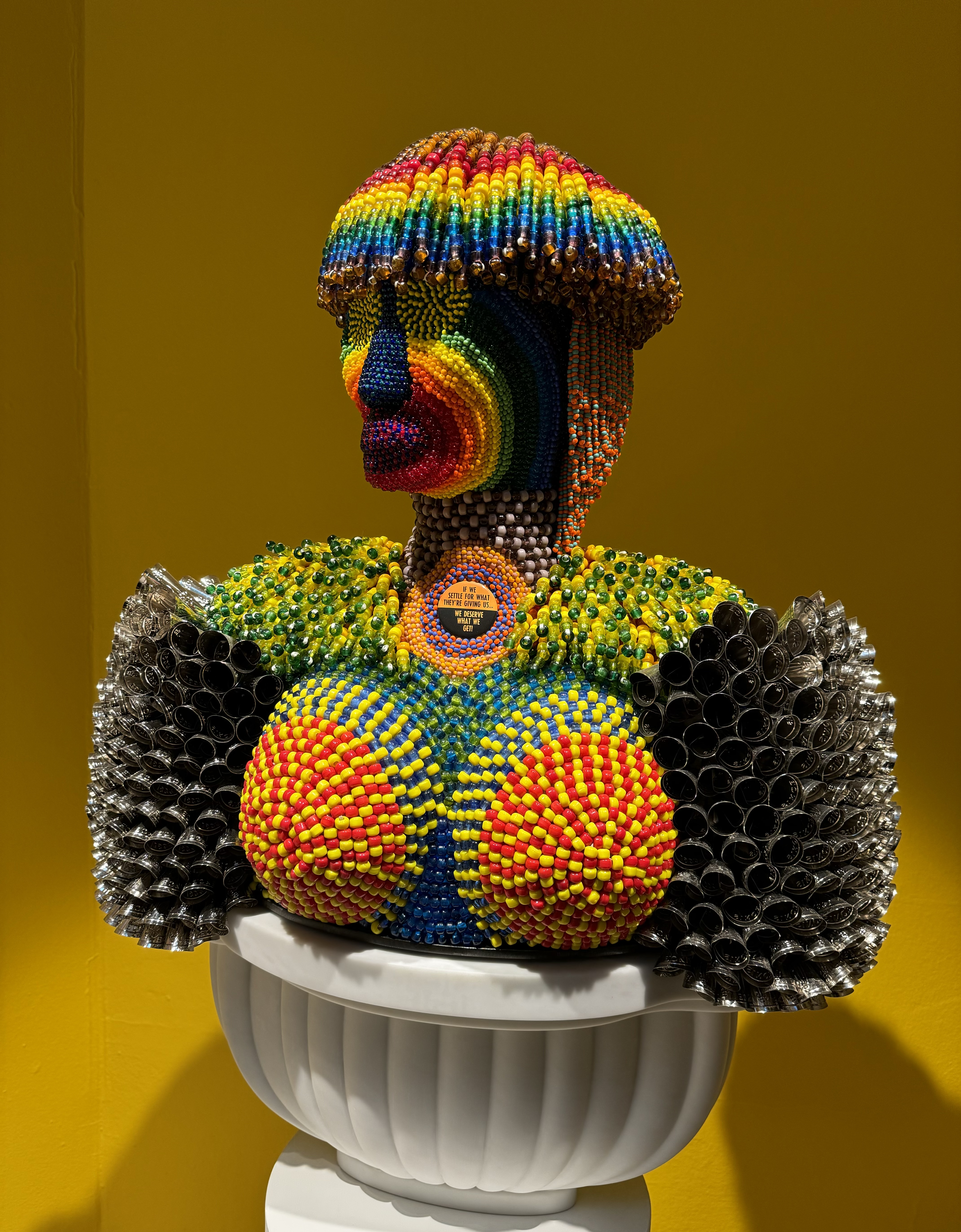 Посетители без устали фотографируют павильон США, фасад которого радикально преображен художником Джеффри Гибсоном, потомком индейцев из племен чокто и чероки. Гибсон породнил красочность эстетики коренных американцев, не боящихся сочетания самых истеричных оттенков, с квир-фантазией, и в его украшенных бусинами скульптурах несложно различить отсылку к радужному флагу ЛГБТ-движения.