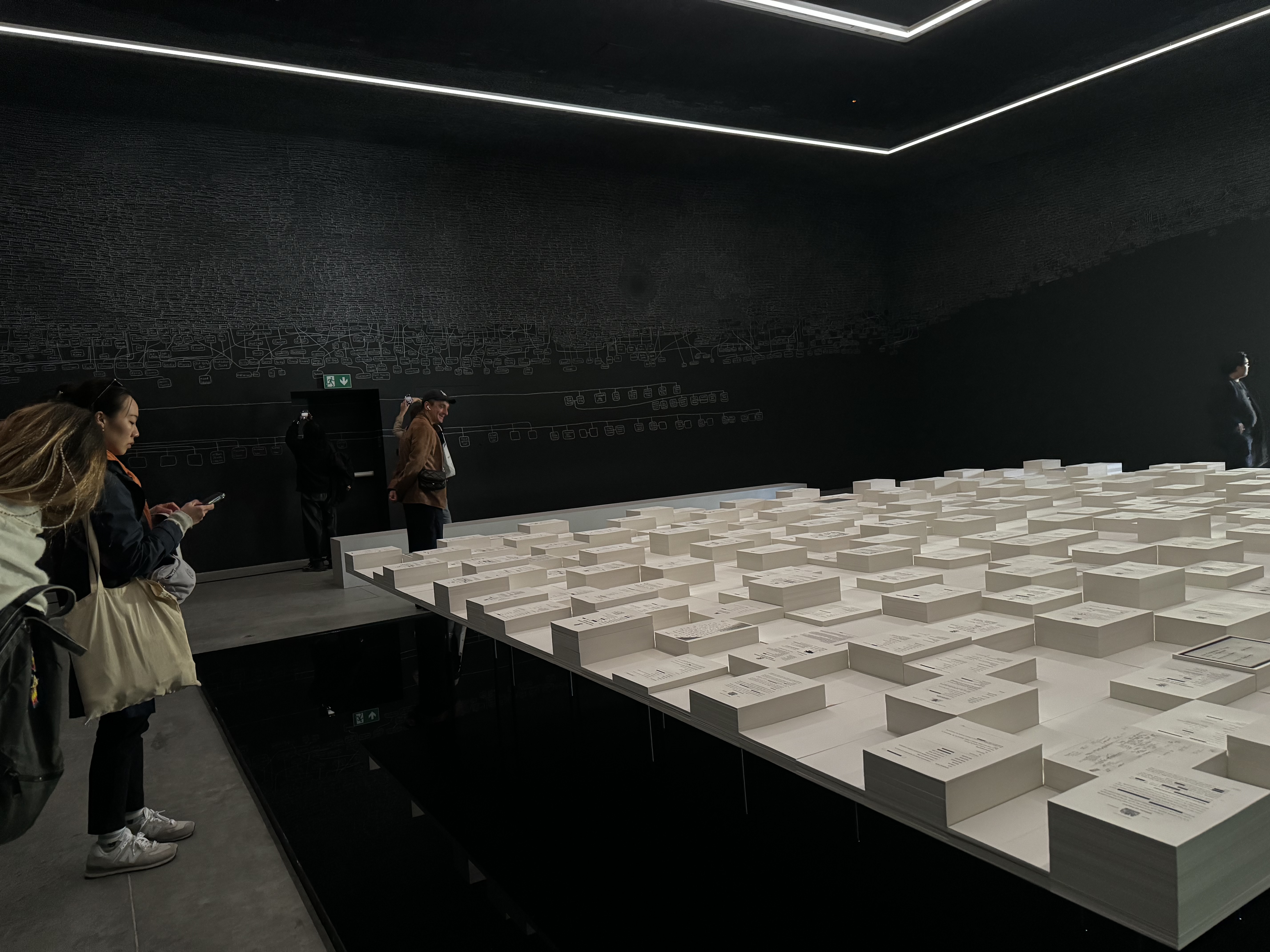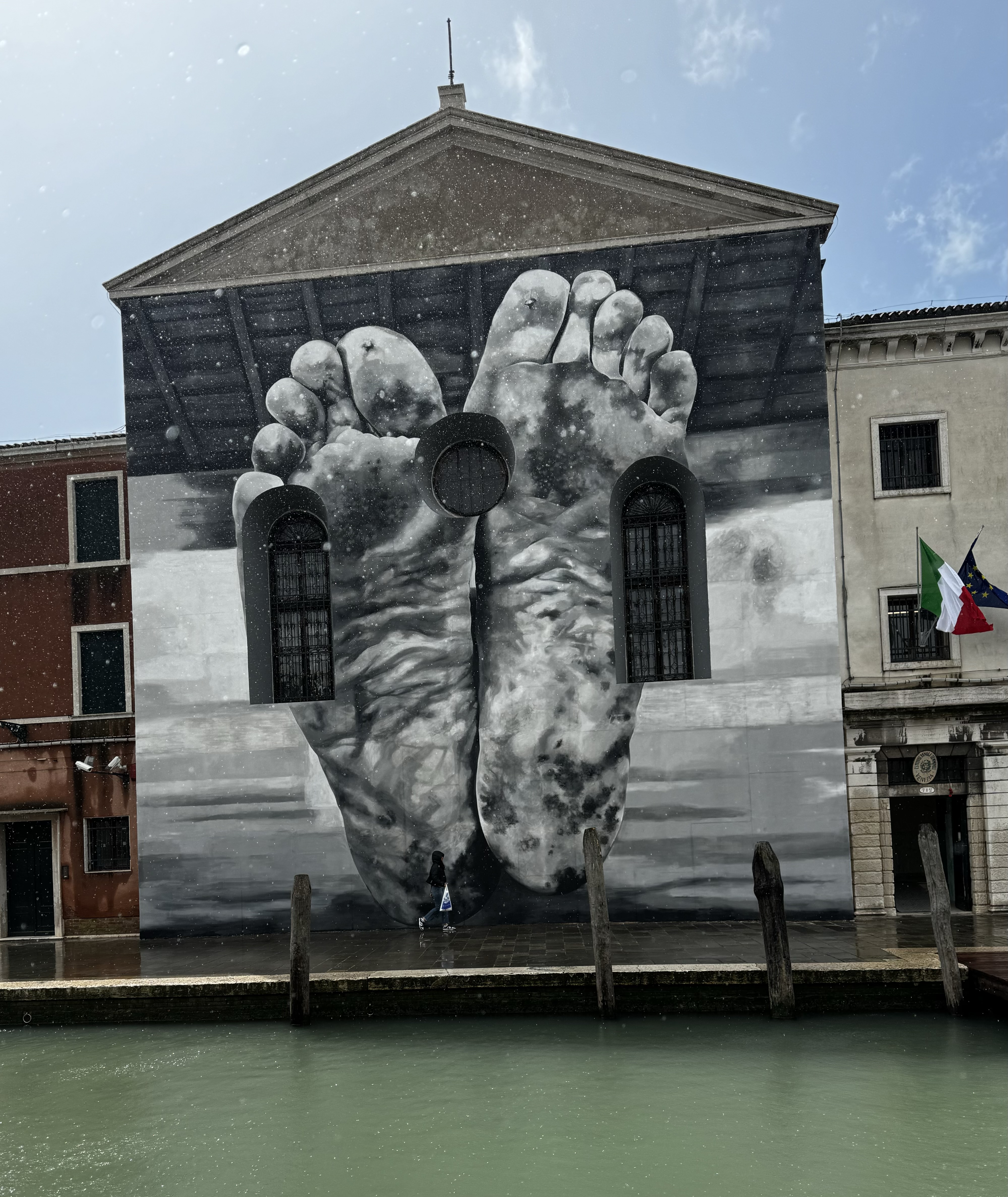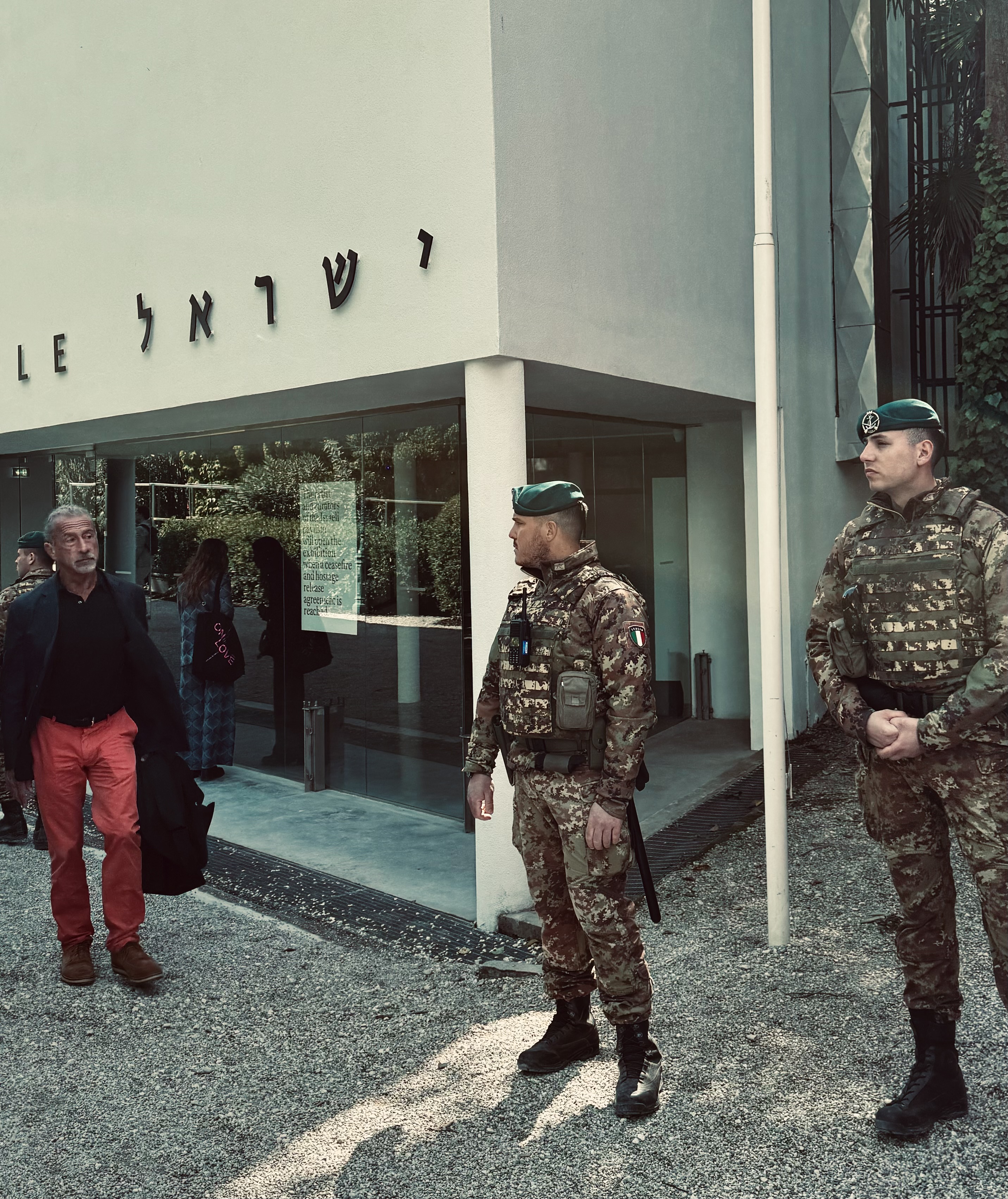 О мрачных событиях, происходящих за пределами мира арт-фантазий, напоминают пикет с палестинскими флагами у входа в Сады Биеннале, вооруженная охрана израильского павильона и разбросанные возле него алые листовки с требованием запретить "Павильон геноцида". Впрочем, посетить его и так невозможно, на стекле висит плакат с пояснением, что павильон откроется только после прекращения боевых действий и освобождения заложников.