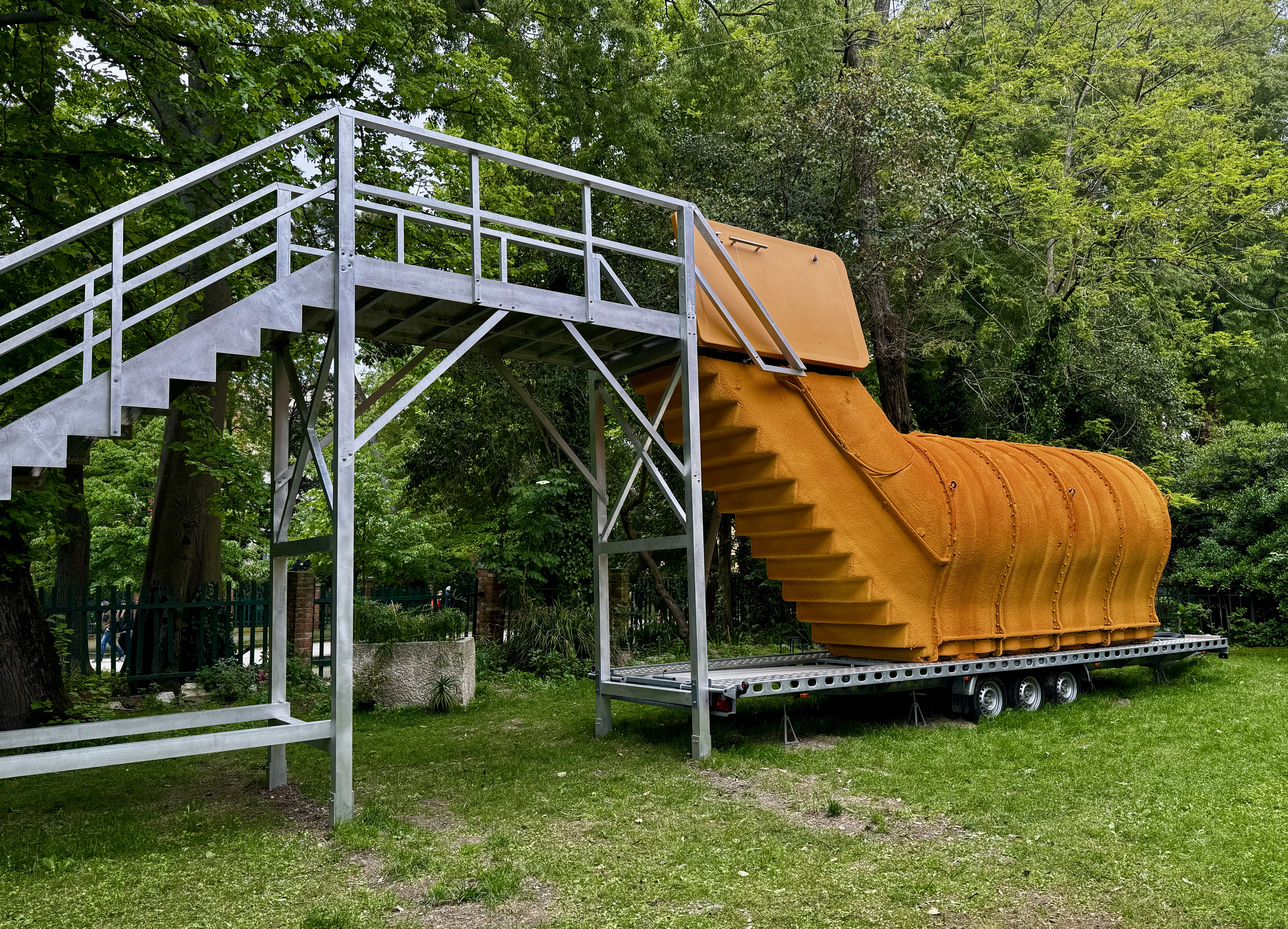Из печального дома переберемся в смешной. Венеция – город на сваях, и подвалов в домах тут, как правило, нет. Словенская художница Ника Шпан обнаружила, что в Польше продаются искусственные подвалы из пластика, которые можно сразу вмонтировать в строящиеся здания. Она привезла такой подвал в Венецию и водрузила его на платформу, так что зритель может зайти в сад, подняться, а затем как бы спуститься под землю, оставаясь над нею. Всех тайн этого милого двухминутного аттракциона открывать не буду, а называется он "Садовый секрет для тебя".
