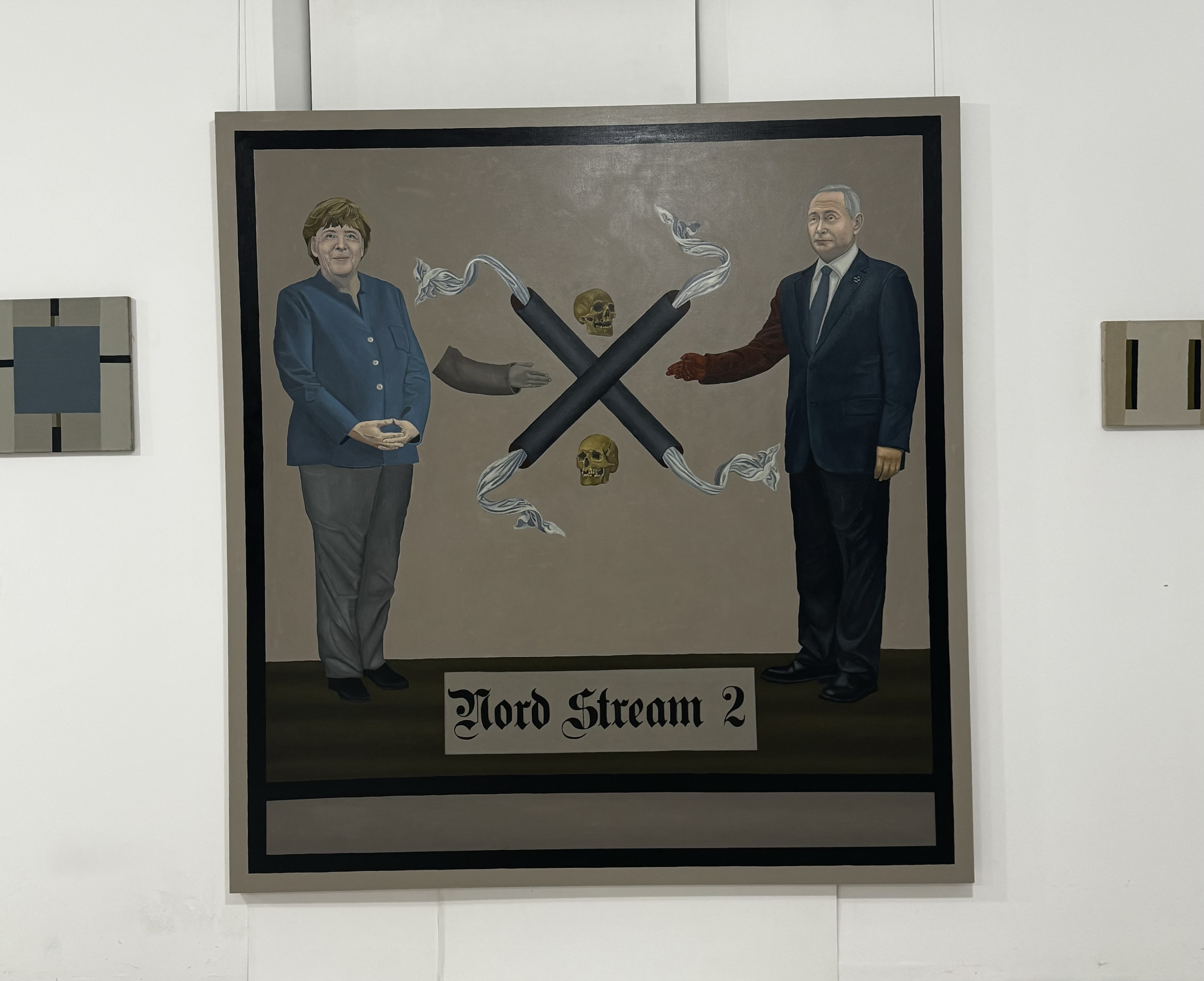 С этим павильоном связан политический скандал. Изначально представлять Польшу на биеннале должна была не украинская Open Group, а художник Игнаций Чвартош, придерживающийся консервативных взглядов. Его проект носил название "Польские упражнения в мировой трагедии: между Германией и Россией". Но партия "Право и справедливость", поддерживавшая Чвартоша, проиграла выборы, и новое правительство Польши решило отказать художнику, живопись которого не отвечает теме "Чужестранцы повсюду". Чвартош не сдался, арендовал скромное помещение в двух шагах от бокового входа на биеннале и развесил свои картины. О его выставке "Польша без цензуры" написала New York Times, но успехом она не пользуется, а я зашел, чтобы сфотографировать портрет не очень похожего на себя Путина, связанного с Меркель свастикой газовых труб. Марта Чиж, которая курирует нынешнюю выставку в польском павильоне, называет Чвартоша "фашистским художником". Не уверен, что она права, но нет сомнений в том, что, появись эти работы на биеннале, они бы многих шокировали. Значительная часть картин – портреты героев польского антикоммунистического подполья 40–60-х годов, причем изображены партизаны в момент казни, с пулевыми отверстиями. Кроме того, есть портреты избежавших наказания нацистских военных преступников со списками их злодеяний. Чвартош полагает, что СССР и Третий Рейх растоптали Польшу в 1939 году, а Россия и ФРГ занимаются тем же самым сейчас.
