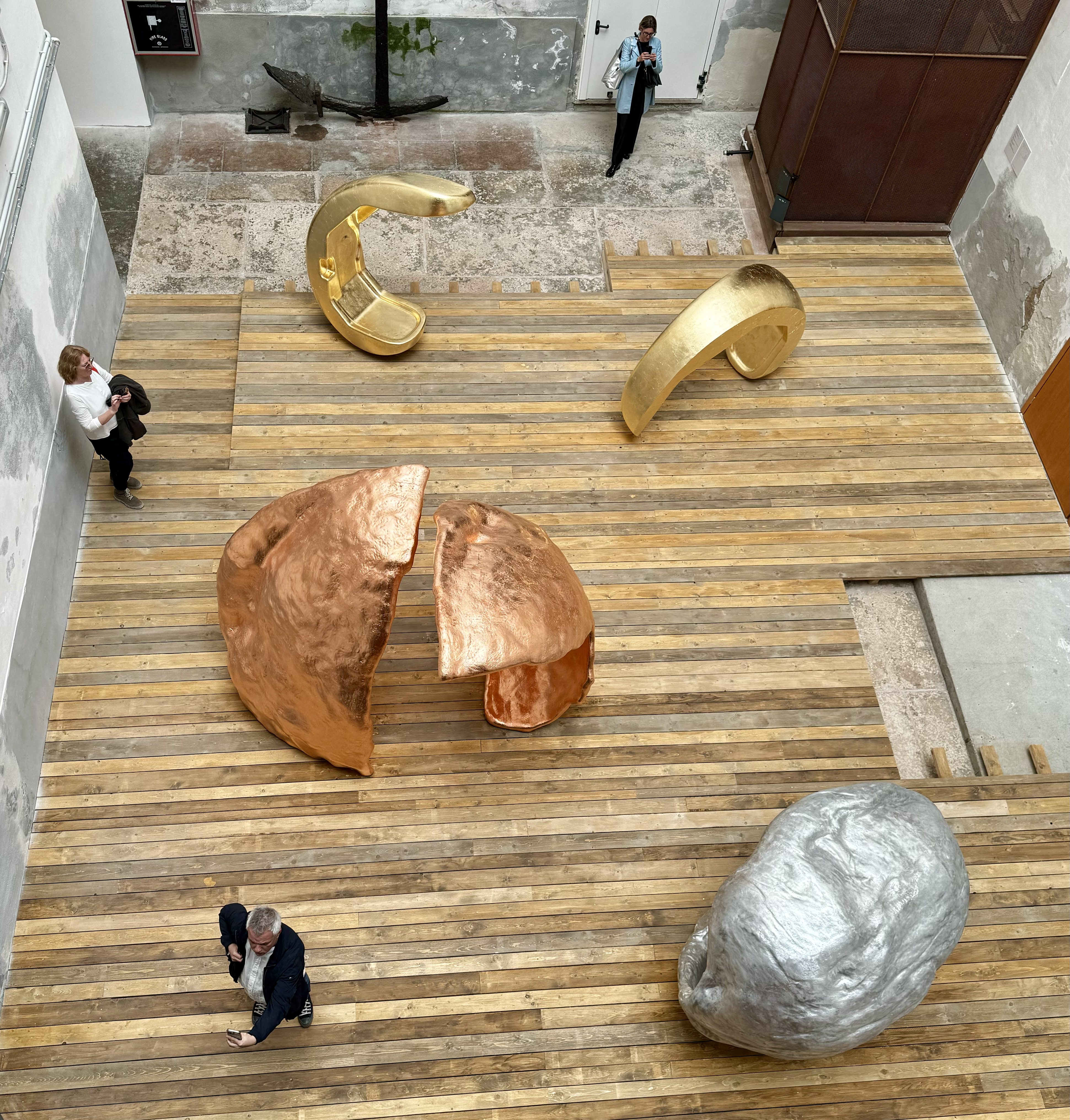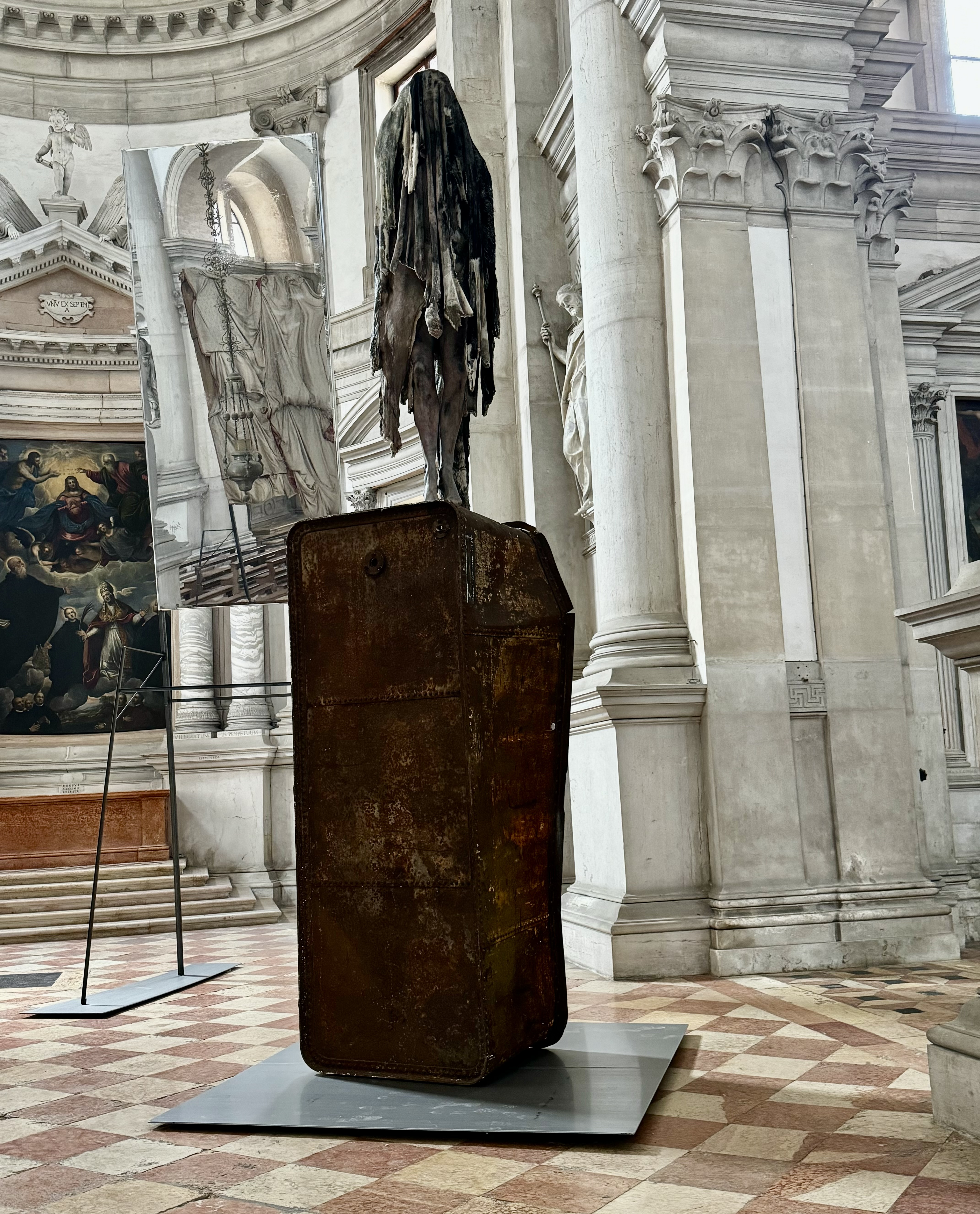 Еще одну коллективную выставку украинских художников организовал Фонд Виктора Пинчука в палаццо Контарини-Полиньяк. Отмечу "Русское современное барокко" Жанны Кадыровой: к духовым трубам старинного органа прилажены останки российских снарядов, найденных в Киевской области. В этой работе, поясняет Кадырова, речь идет о "великой русской культуре", которая считается гуманистической. Но у русской культуры есть и потаенная, бесчеловечная сторона, хорошо знакомая украинцам, которые каждый день слышат сирены воздушной тревоги.