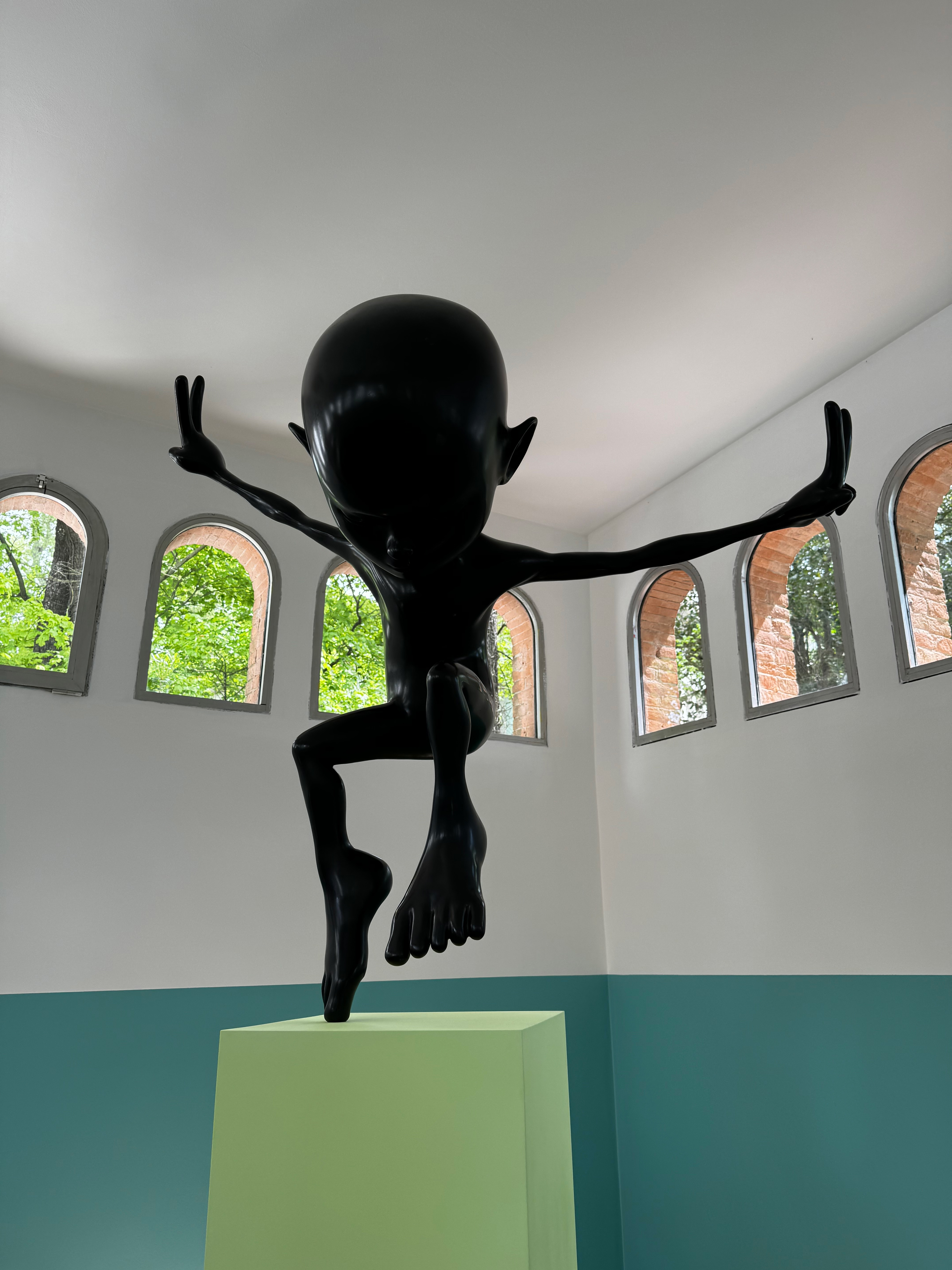 Павильон Южной Кореи тоже радикально преображен. Художник Ку Чжон А (небинарная личность, поэтому буду называть его во множественном числе) работают с ароматами. С помощью анкетирования как корейцев, так и иностранных гостей они собрали 600 воспоминаний о запахах, ассоциирующихся с различными районами Кореи, от благоухания азалий до смрада умирающего дедушки. В их коллекции есть запах старой электроники, запах сохнущего белья, а также безрадостная вонь КНДР. Для выставки в Венеции были выбраны 16 запахов, которые поочередно наполняют павильон, а также созданы духи, называющиеся так же, как и выставка: Odorama Cities. Все эти 16 запахов прячутся внутри застывшего в прыжке черного мальчугана, являющегося символическим портретом души Ку Чжон А, – и периодически, вылетая у него из ноздрей, заполняют элегантно оформленное пространство павильона.