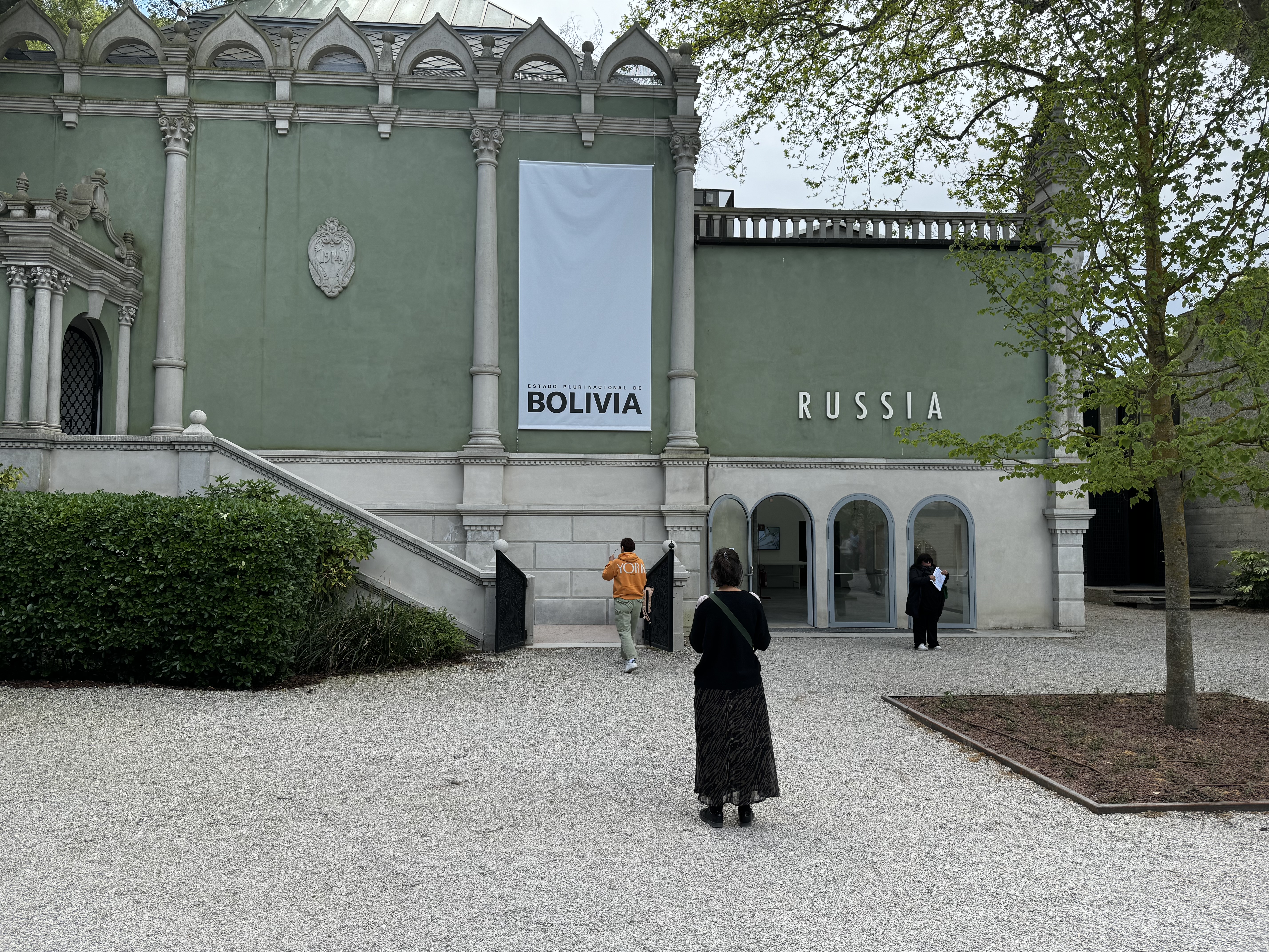 После вторжения в Украину Россия в Венецианской биеннале не участвует. В 2021 году щусевский павильон с помпой отреставрировали, но в 2022-м он стоял пустой. Не открылся и в следующем году, когда проходила биеннале архитектуры. Теперь он передан Боливии, и сейчас там открыли коллективную выставку боливийских художников "Вглядываясь в будущее минувшее, мы движемся вперед". Злые языки говорят, что неожиданная метаморфоза связана с интересом российских госкомпаний к боливийским месторождениям лития. Живопись коренных народов Боливии в этом имперском особняке смотрится неожиданно, а архивный фильм про чернокожего бодибилдера, который показывают в одном из помещений, вообще кажется диверсией, потому что в нем можно усмотреть гомоэротическую подоплеку, ненавистную путиноидам.