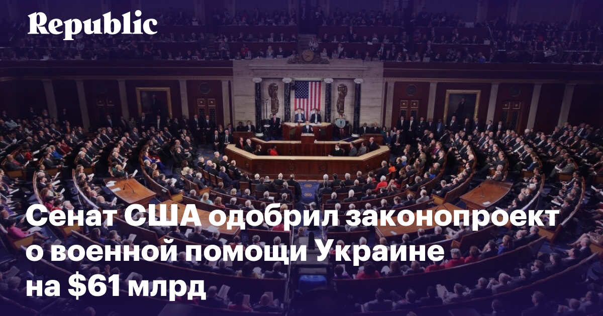 Сенат США одобрил застрявший в Конгрессе законопроект о выделении помощи Украине на $61 млрд. Законодатели также приняли законопроекты о финансовой помощи Израилю и Тайваню. Теперь документы должен подписать президент США Джо Байден, он пообещал это сделать незамедлительно.