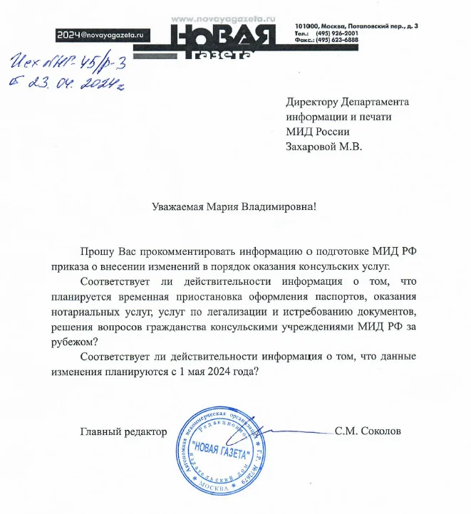 Консульский департамент МИД РФ сделал громкое заявление о «провокационном характере» публикации в тг-канале «Новой газеты». На это хотим еще раз заметить, что у МИД РФ были все возможности высказаться до публикации — соответствующий запрос был направлен. Очевидно, не нашлось времени в Департаменте информации и печати, чтобы сформулировать позицию ведомства, подтвердив или опровергнув информацию о том, что подобный документ был изготовлен сотрудниками министерства.
