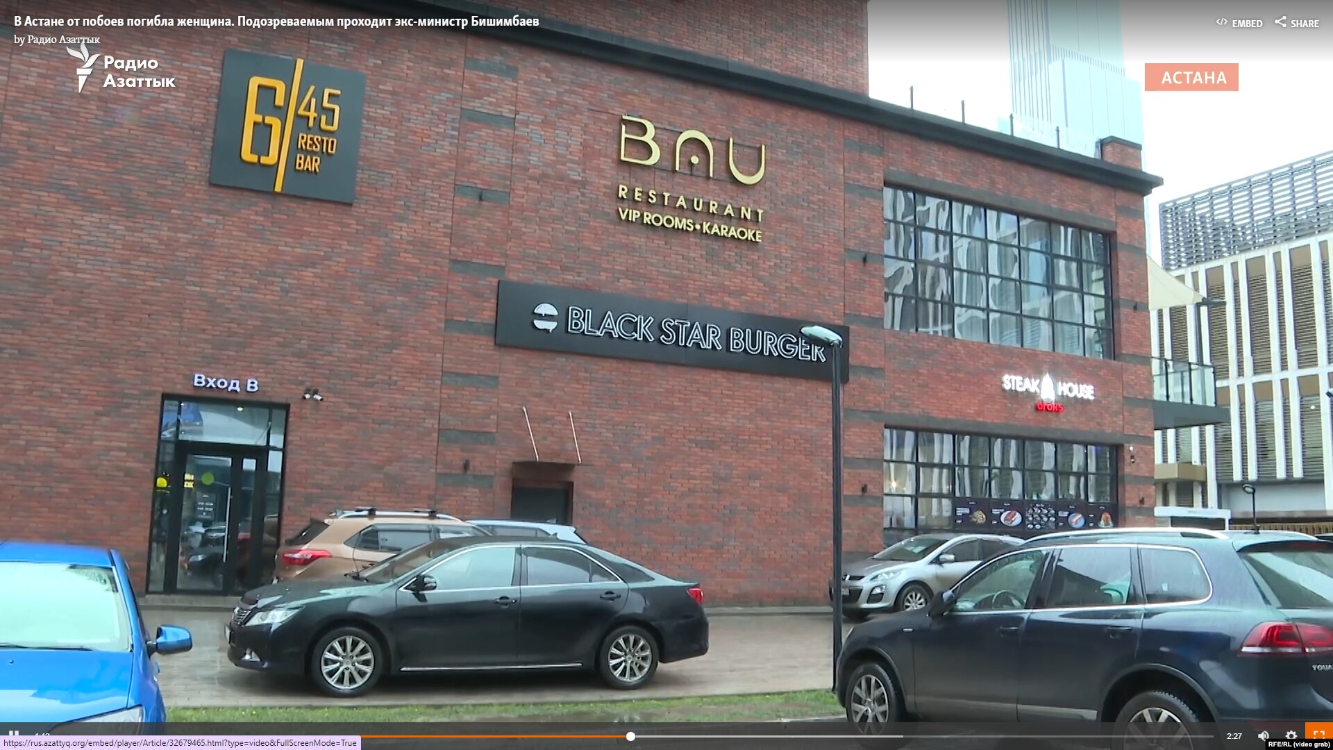 Как выяснилось позже, в ресторане, который контролирует семья Бишимбаевых, между супругами произошёл конфликт, который, судя по записям камер наблюдения, перерос в рукоприкладство. На видео, которые восстановили в ходе следствия (после трагедии записи по требованию Бишимбаева были удалены), видно, как мужчина наносит удары по лицу женщины, она падает на пол, он с силой пинает её.