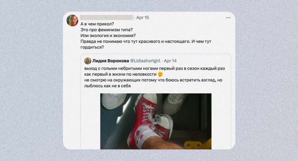 Думаю, в целом мне повезло — во взрослом возрасте я не сталкивалась с откровенной грубостью. Одна интернет-подруга при встрече даже сказала, что мое решение так ходить — смелое, и она его уважает. На работе меня спрашивали, почему я не бреюсь. Я терпеливо объясняла: это потому, что я феминистка, и я принципиально не удаляю волосы.