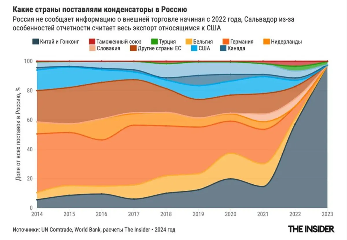 В 2021 году четверть всех поставок конденсаторов приходила в РФ из Сальвадора напрямую. Теперь их, вероятно, везут через Китай — значительная часть конденсаторов, которые пришли в Россию из Китая в 2023 году, в графе «страна происхождения» в таможенных базах имеет отметку «Сальвадор».