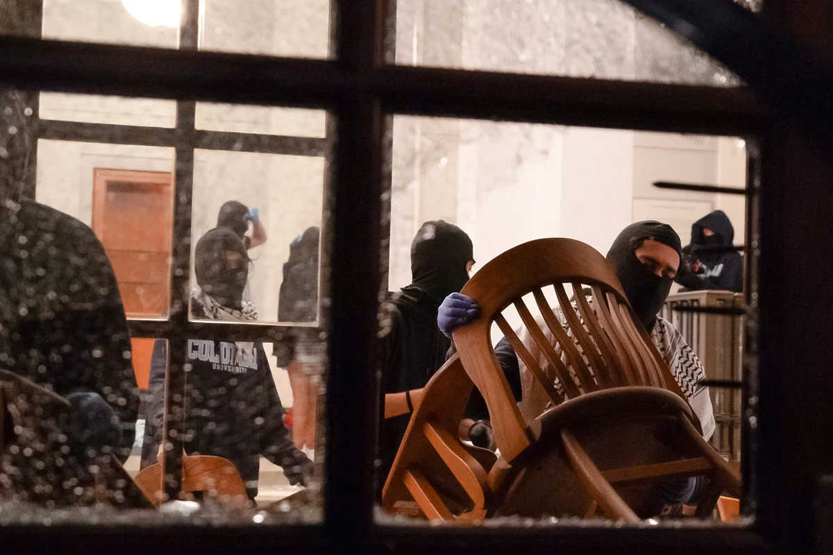 Помимо блокировки зданий и входов студенты разбивали большие палаточные лагеря на территории, строили баррикады и ломали камеры наблюдения. «Свободу Палестине! Отпустите студентов!» — скандировали протестующие.