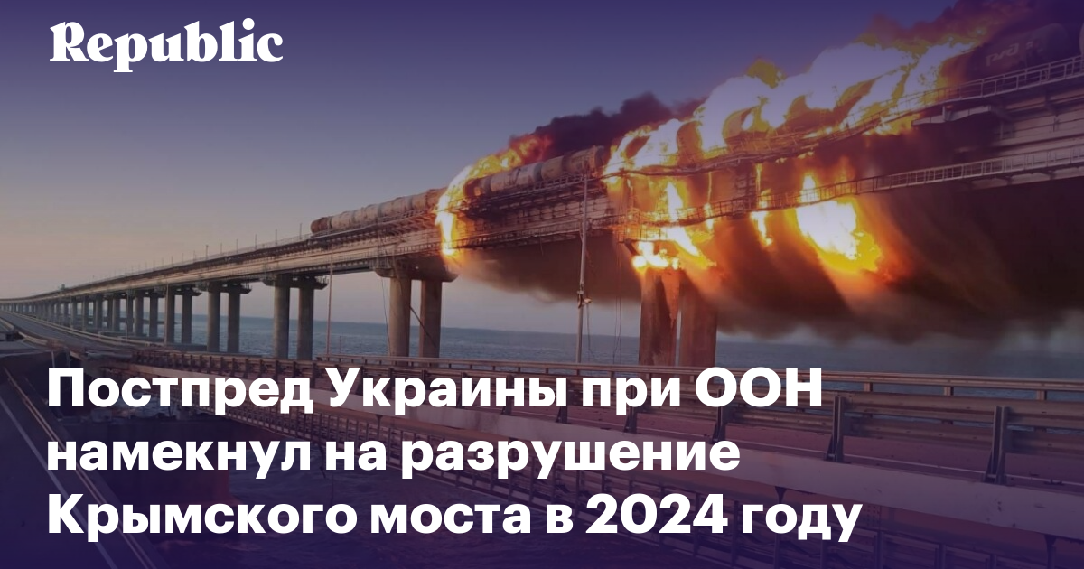 Постпред Украины при ООН Сергей Кислица намекнул на то, что Крымский мост, соединяющий аннексированный полуостров с материковой Россией, исчезнет в 2024 году. Дипломат опубликовал в соцсети Х картинку с видами мостов и их названиями. Среди прочих там присутствует название «Керченский», однако, в отличие от других, изображения самого путепровода нет. Ранее с подобным намеком выступил посол Литвы в Швеции и экс-глава литовского МИДа Линас Линкявичюс.