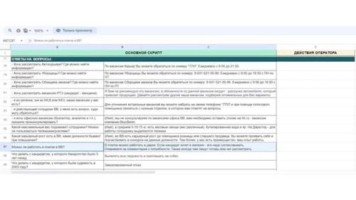 Скриншот с таблицей скриптов ответов на частые вопросы при общении с кандидат:ками